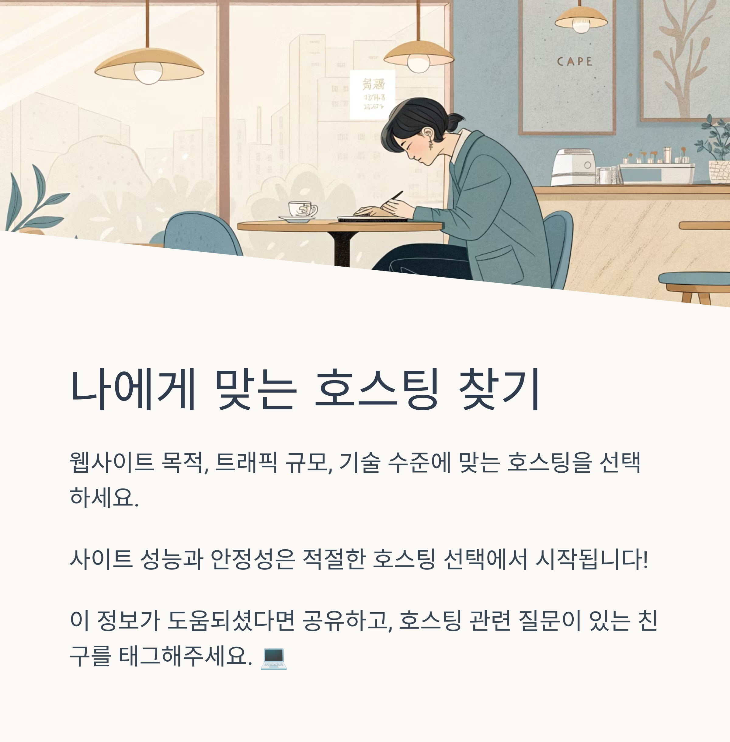 표를 참고해서 나에게 가장 적합한 호스팅 서비스를 선택해보세요. 사이트 목적과 트래픽 예상 규모, 기술 수준을 고려하는 것이 중요해요.