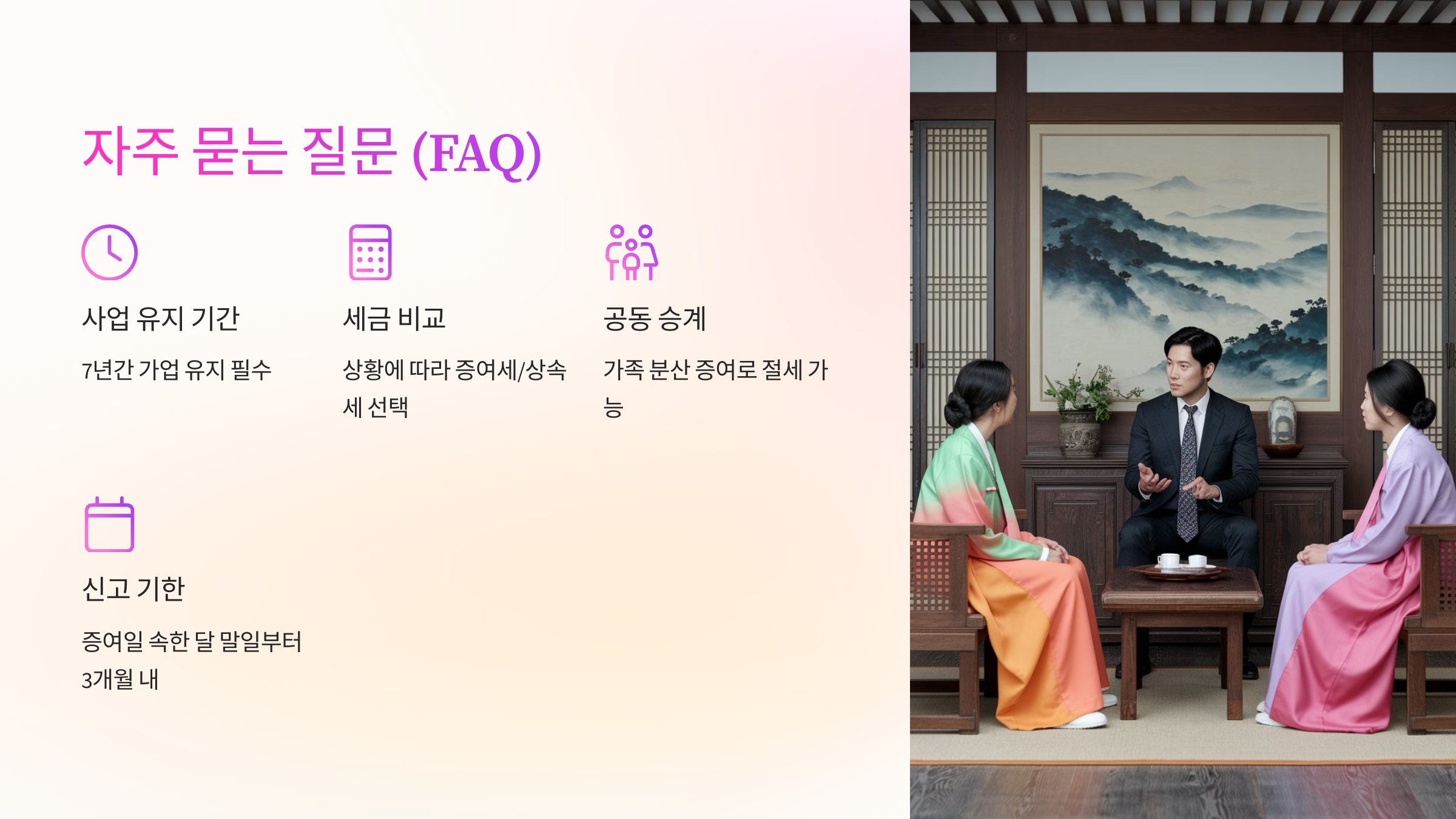 가업 승계는 단순한 재산 이전이 아니라, 기업의 지속 가능성을 고려해야 하는 중요한 과정이에요. 증여세 부담을 줄이기 위해 과세특례나 감면 제도를 잘 활용하는 것이 중요하지만, 사후 관리 요건도 꼼꼼하게 확인해야 해요.