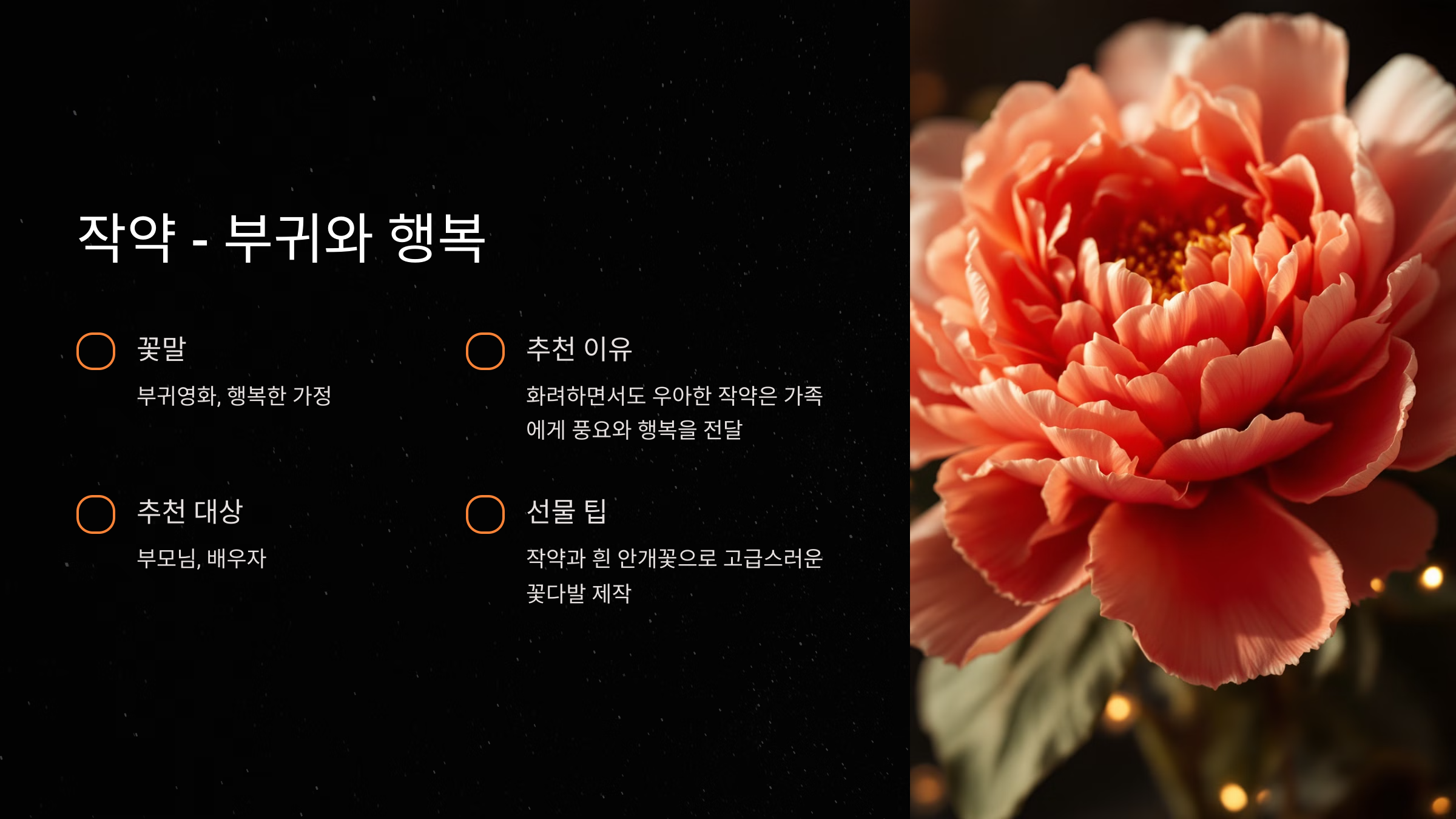 - 추천 이유: 작약은 화려하면서도 우아한 꽃으로, 가족에게 풍요와 행복을 전하기에 제격입니다. 특히 결혼기념일이나 부모님께 드리는 선물로 추천드려요.