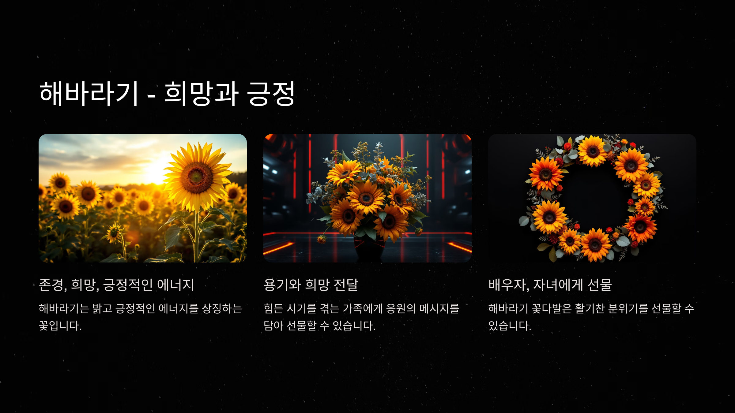 - 추천 이유: 해바라기는 밝고 긍정적인 에너지를 상징하는 꽃으로, 가족 구성원들에게 용기와 희망을 전하고 싶을 때 적합합니다. 특히 힘든 시기를 겪고 있는 가족에게 응원의 메시지를 담아 선물해보세요.