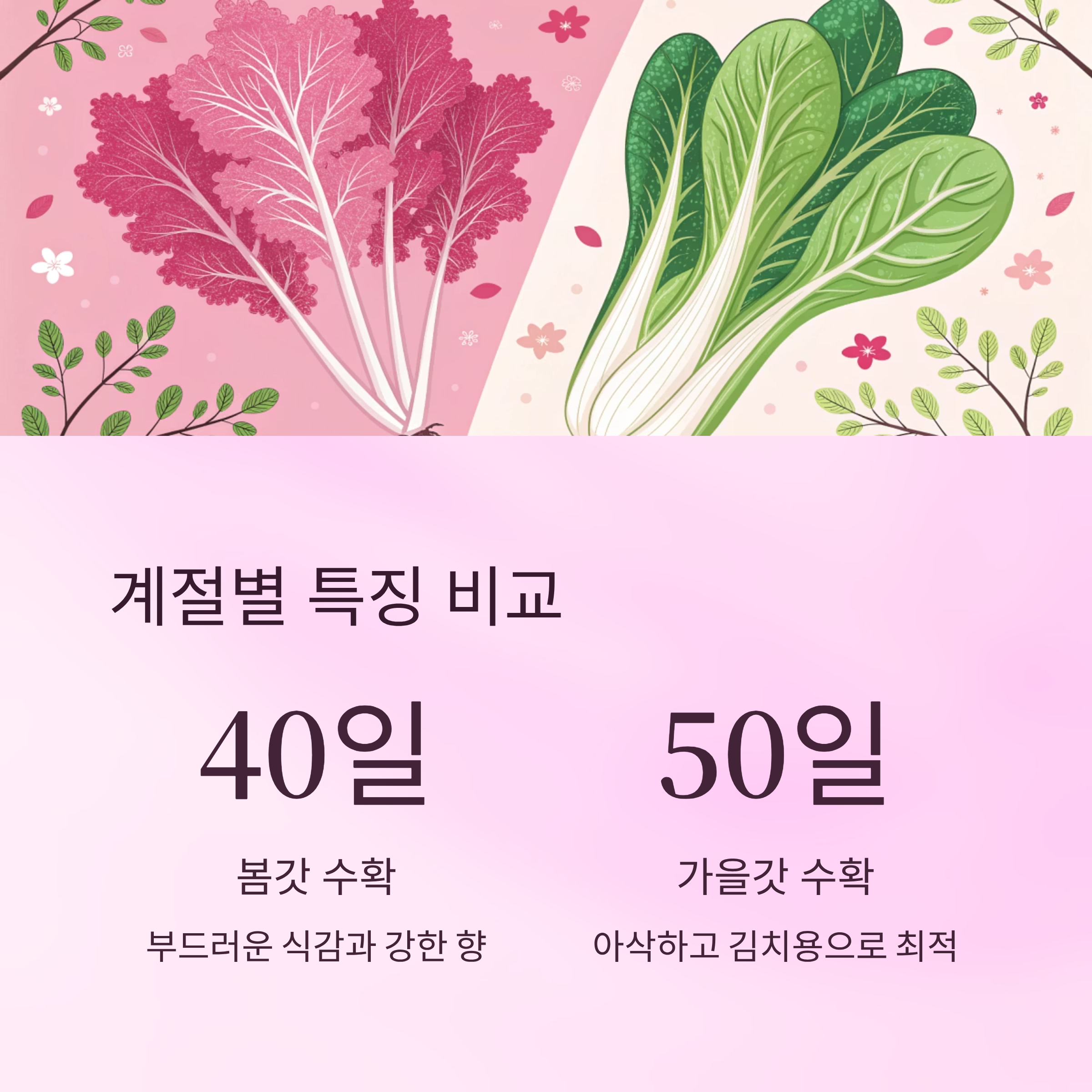 이 표처럼 갓은 계절마다 조금씩 특징이 달라요. 봄에는 비교적 빠르게 수확할 수 있고, 가을에는 보다 향이 진하고 김치에 활용하기 좋은 품질의 갓이 자라요. 내가 생각했을 때 가장 맛있는 갓은 가을에 심어 기온이 선선할 때 수확한 것이었어요.
