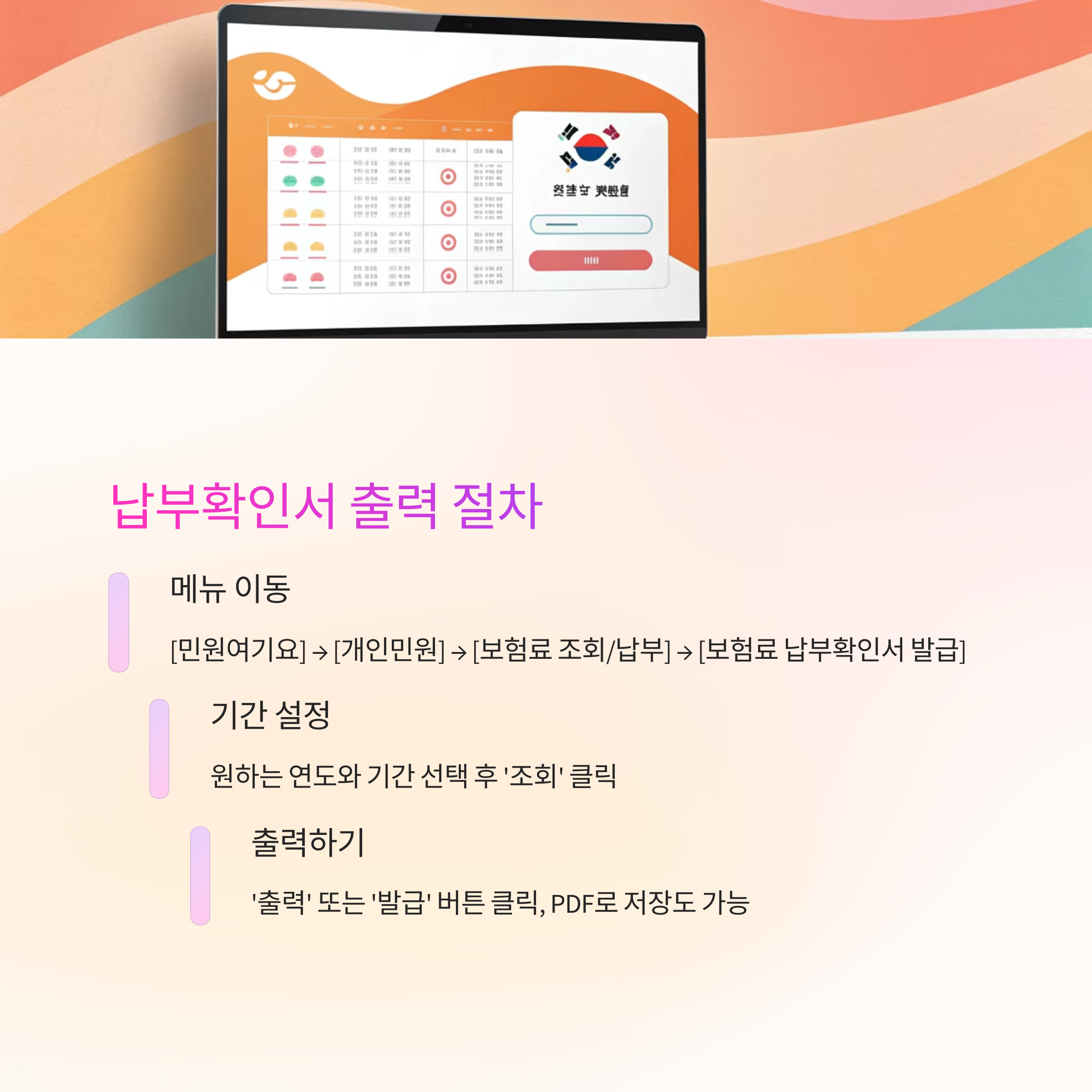 로그인 후에는 '보험료 조회/납부' → '납부확인서 발급' 메뉴를 따라가면 아주 쉽게 출력 페이지로 이동할 수 있답니다!