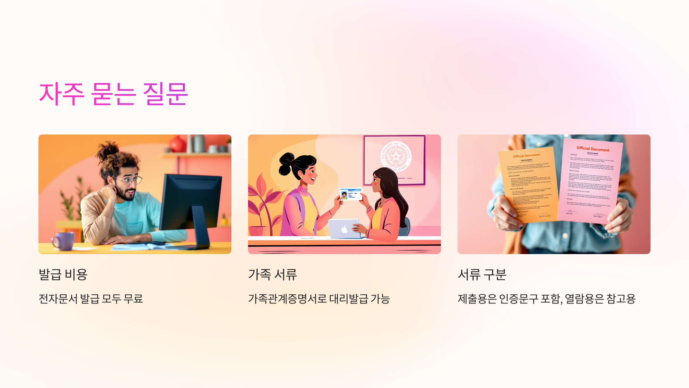 A1. 네, 전자문서로 발급하는 것은 전부 무료예요. 출력이나 PDF 저장도 추가 요금 없이 가능해요.