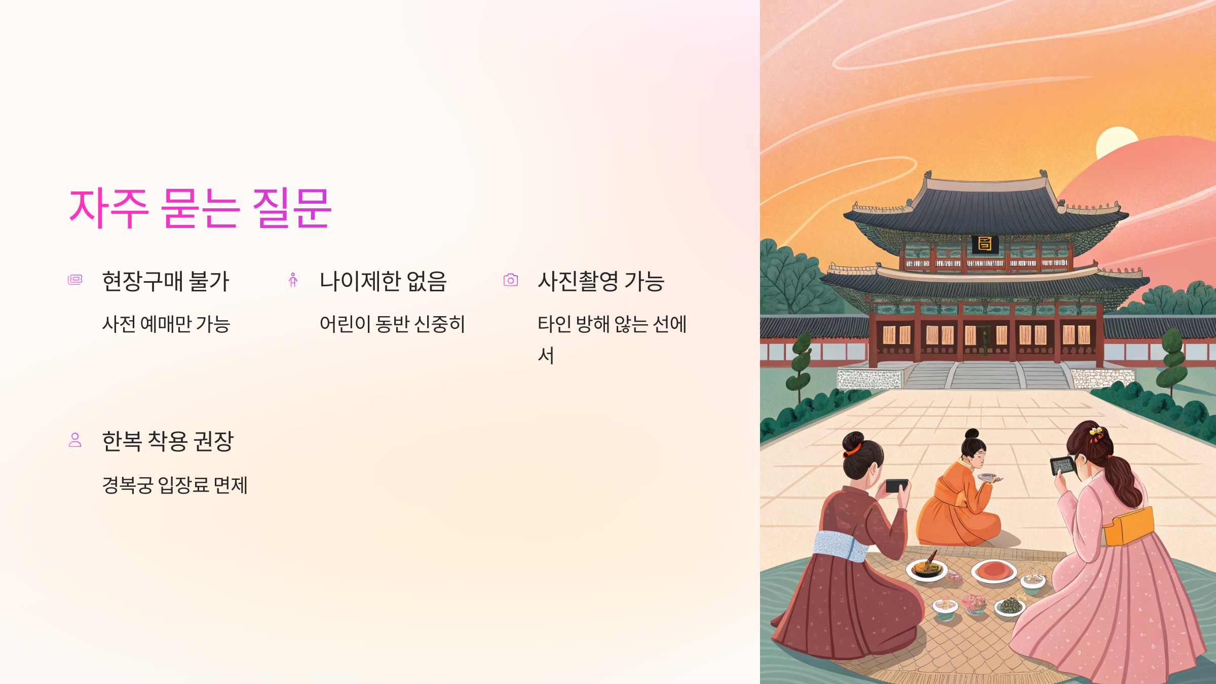 경복궁 입장료는 체험비와는 별도로 지불해야 해요. 하지만 한복을 입고 방문할 경우 경복궁 입장료는 면제돼요! 전통 한복을 입고 고궁을 거닐며 다과를 즐긴다면 더없이 아름다운 경험이 될 거예요.