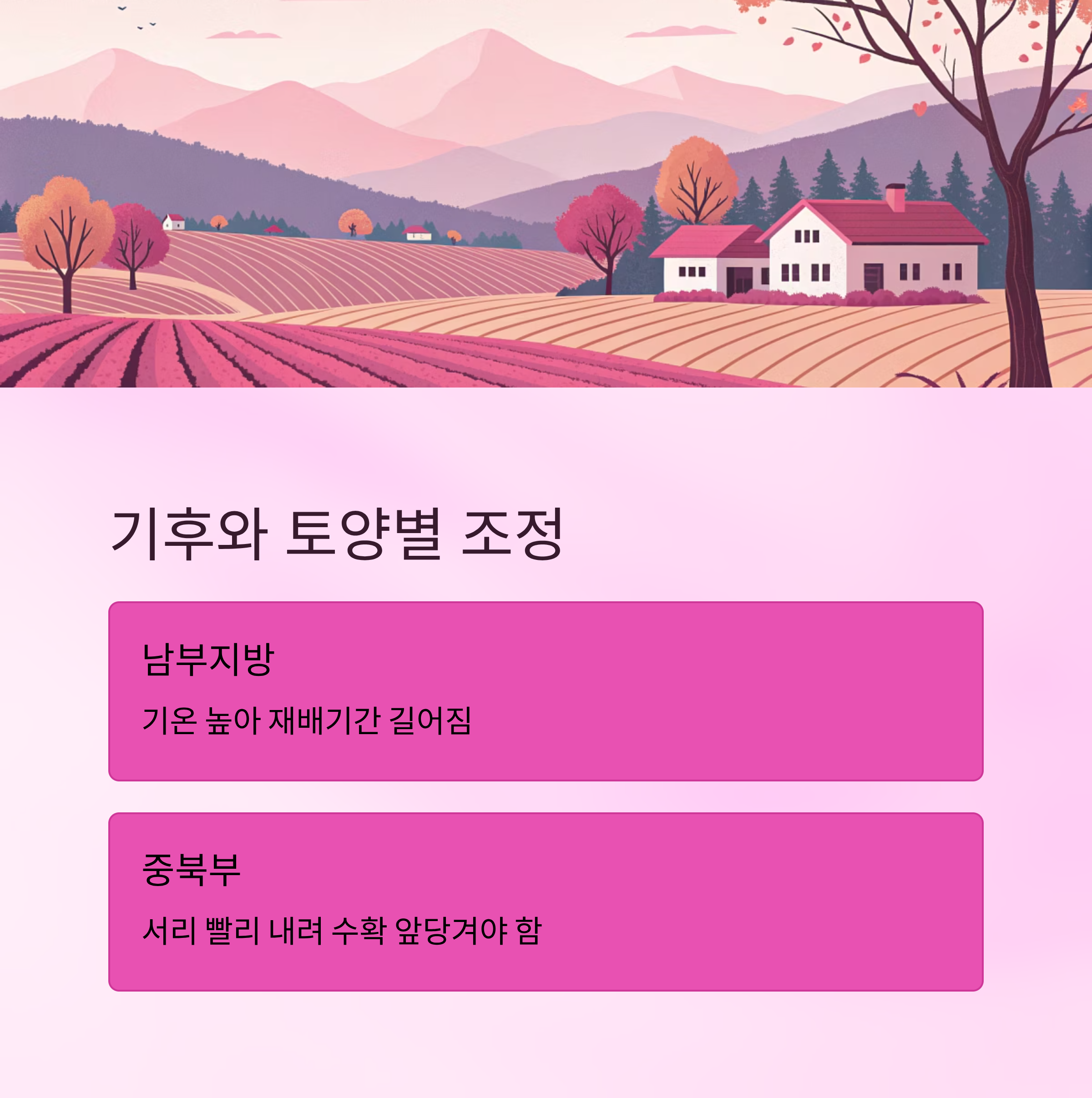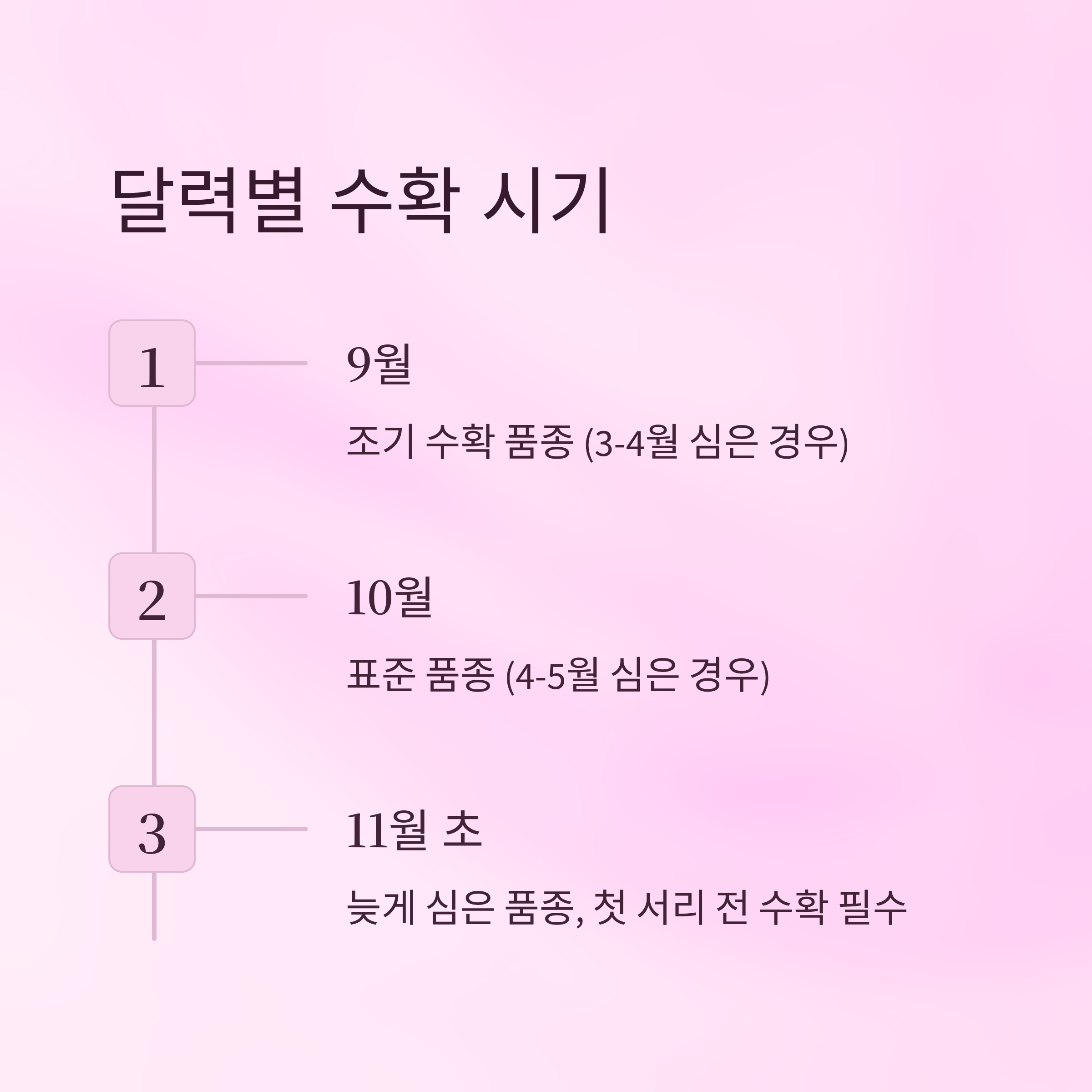 남부 지방과 중부, 북부 지방의 수확 시기는 차이가 있어요. 남부 지방은 기온이 높아 재배 기간이 길고, 중부나 북부는 서리가 빨리 내려 수확 시기를 앞당겨야 하죠.