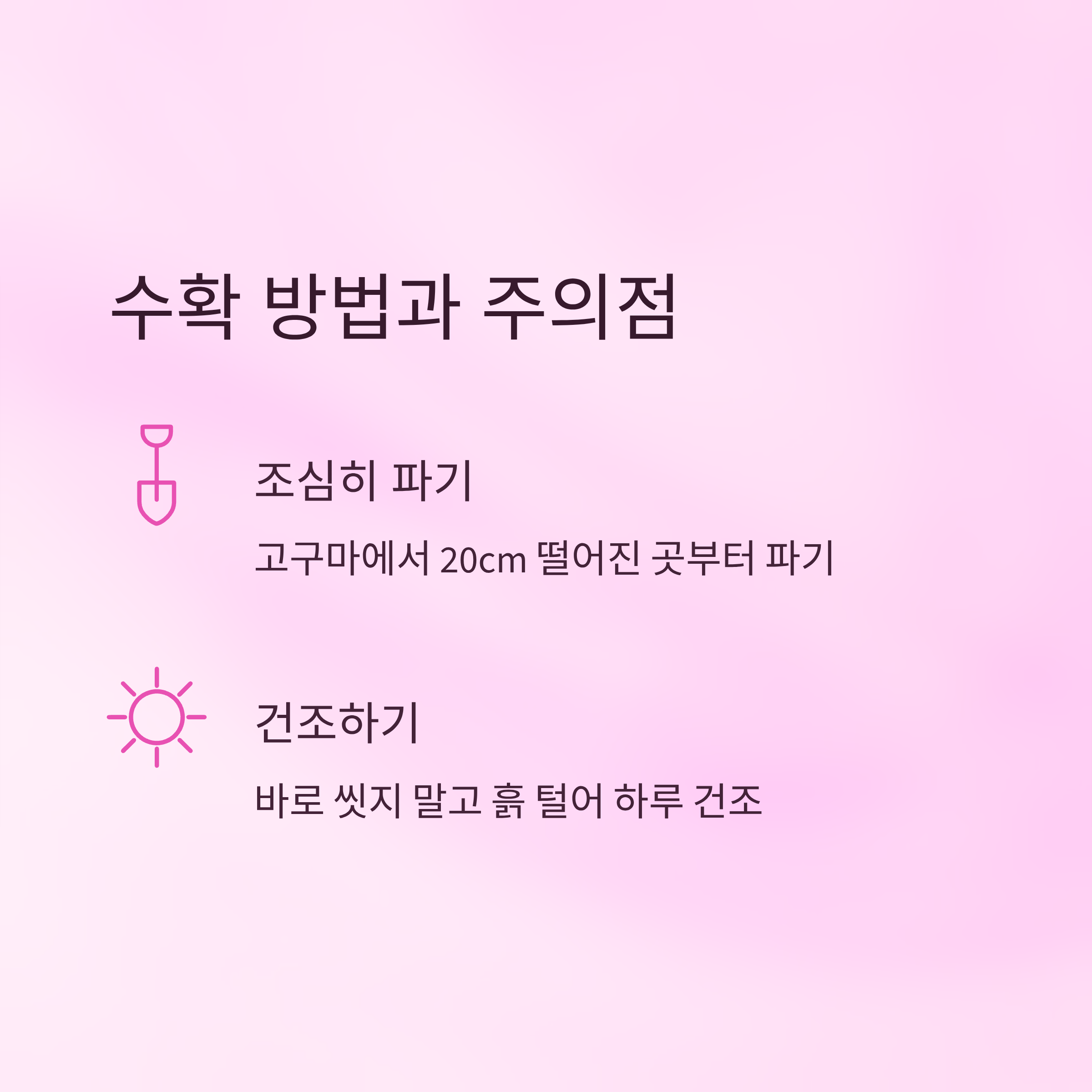 또 비 예보가 있는 주간에는 수확을 피하는 게 좋아요. 비가 오면 토양이 젖어 고구마 표면이 상하고 곰팡이가 생길 가능성이 높아지거든요.