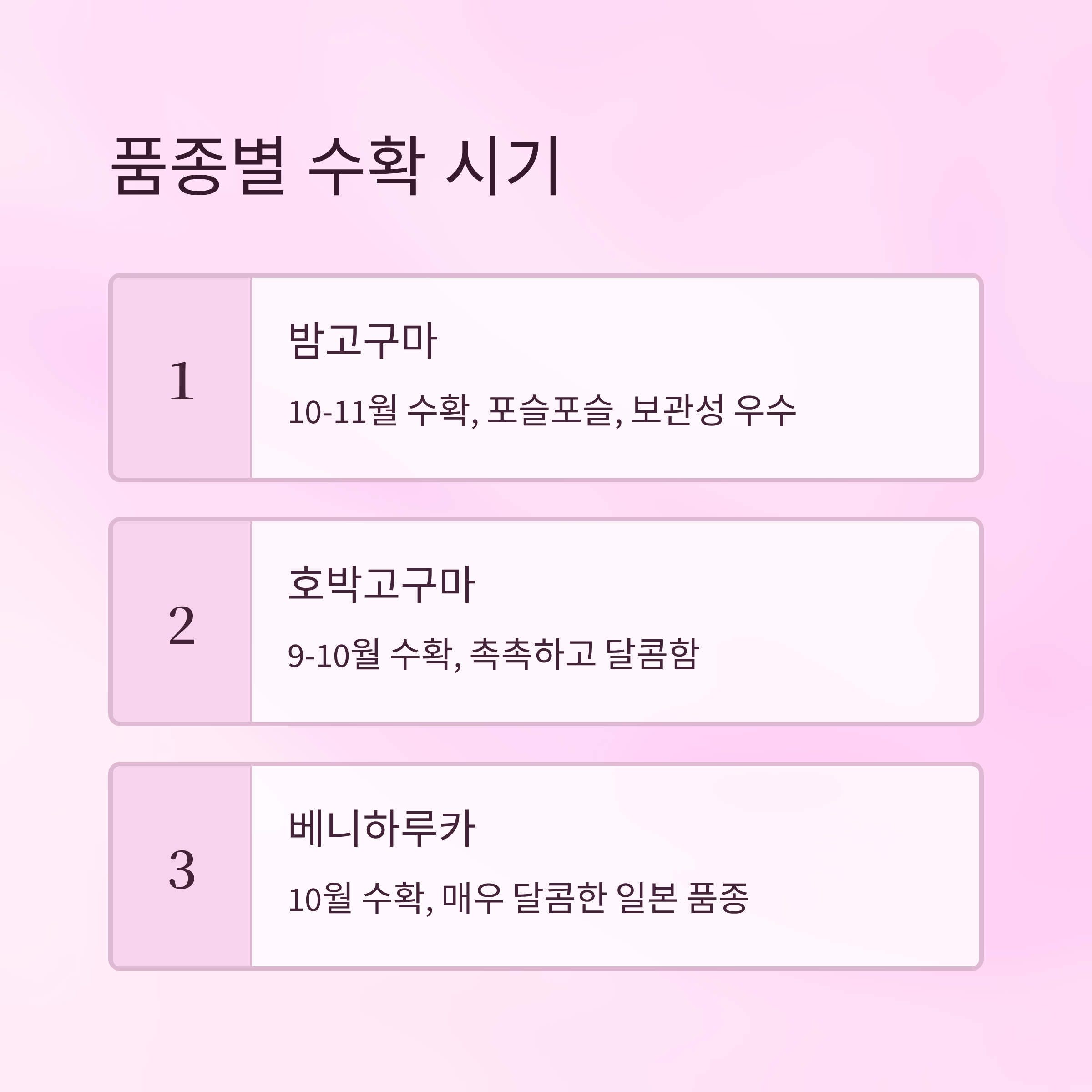 | 밤고구마 | 전분 함량 높음 | 포슬포슬 | 10~11월 | 우수 |