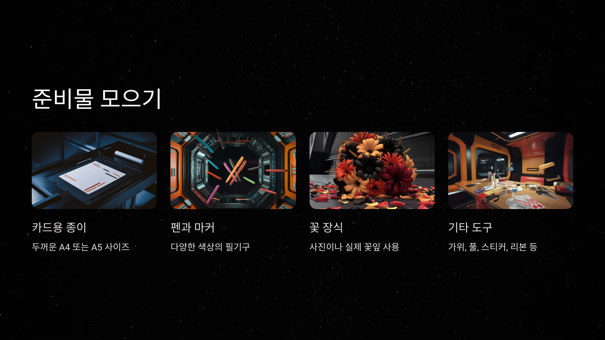 - 장식: 스티커, 리본, 금박펜 등을 활용해 카드에 포인트를 줍니다.