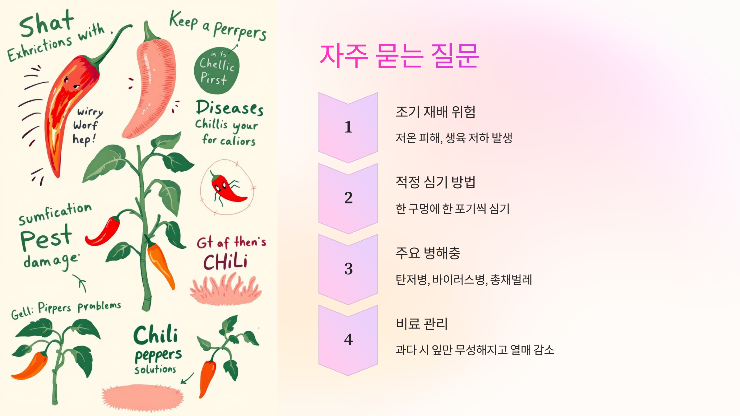 A1. 고추는 따뜻한 기온을 좋아하는 작물이기 때문에 너무 일찍 심으면 저온 피해를 입을 수 있어요. 특히 밤 기온이 10℃ 이하로 내려가면 생육이 느려지고, 잎이 노랗게 변하거나 제대로 자라지 못할 수도 있어요.