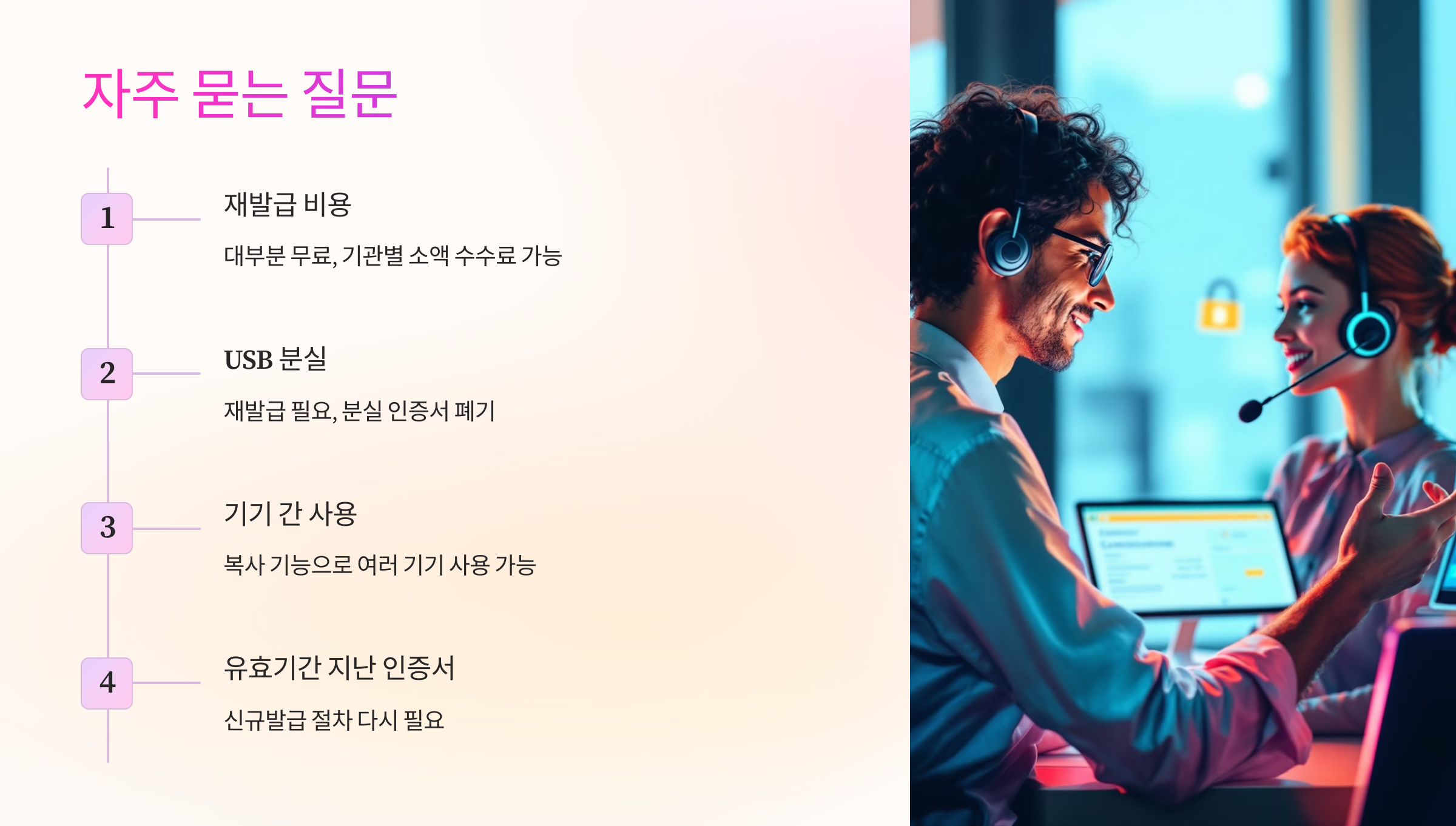 재발급은 기존 사용자라면 훨씬 더 간단해요. 인증서가 저장된 장치만 있다면 별다른 본인 인증 없이도 몇 단계 클릭만으로 재발급이 가능해요. 만약 장치를 잃어버렸다면 본인 확인 절차는 다시 거쳐야 해요.
