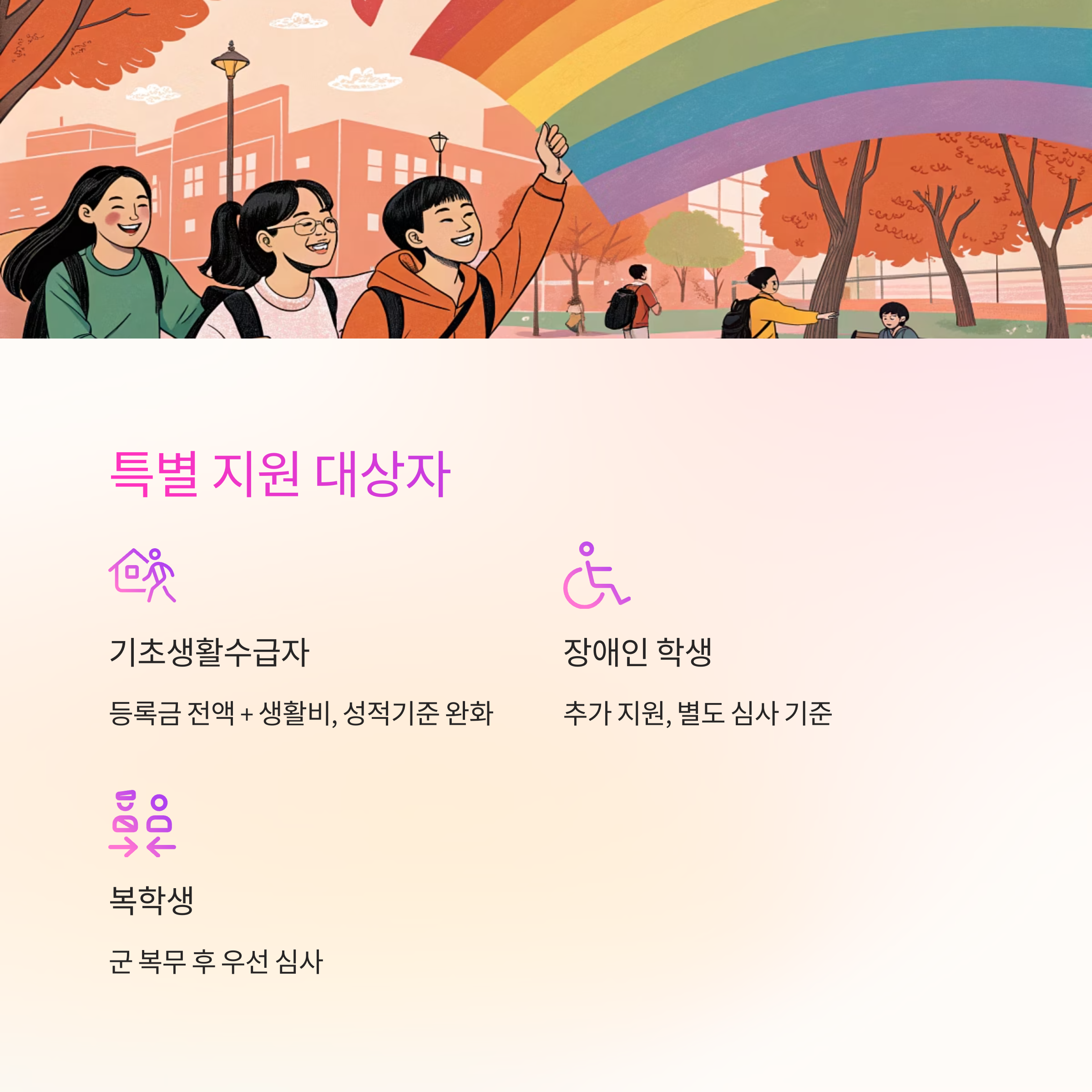 | 기초생활수급자 | 등록금 전액 + 생활비 | 성적기준 완화 |