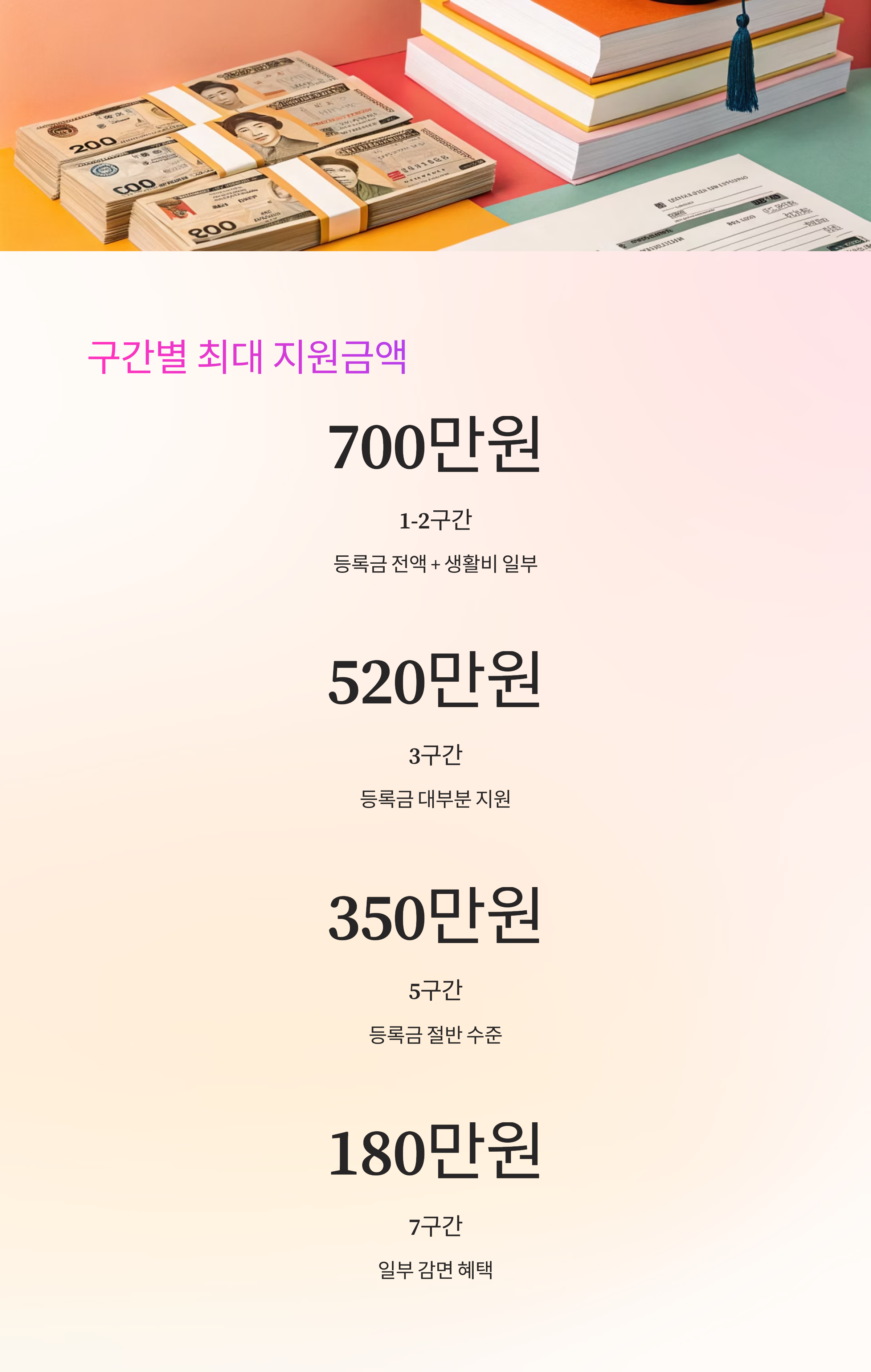 | 1구간 | 700만 원 | 등록금 + 생활비 일부 지원 |