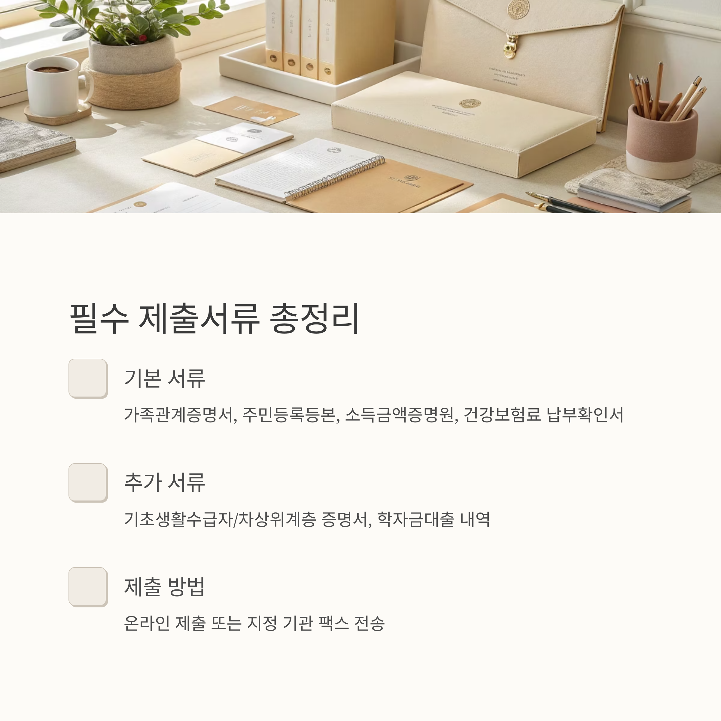 국가장학금은 대학생이라면 반드시 챙겨야 할 대표적인 교육 지원 제도예요. 등록금 부담을 줄일 수 있고, 성적이나 가정형편에 따라 다양한 수준으로 혜택을 받을 수 있답니다. 하지만 신청 시 가장 중요한 것이 바로 '서류 준비'예요. 정확한 서류를 빠짐없이 제출해야 심사에서 불이익이 없어요.