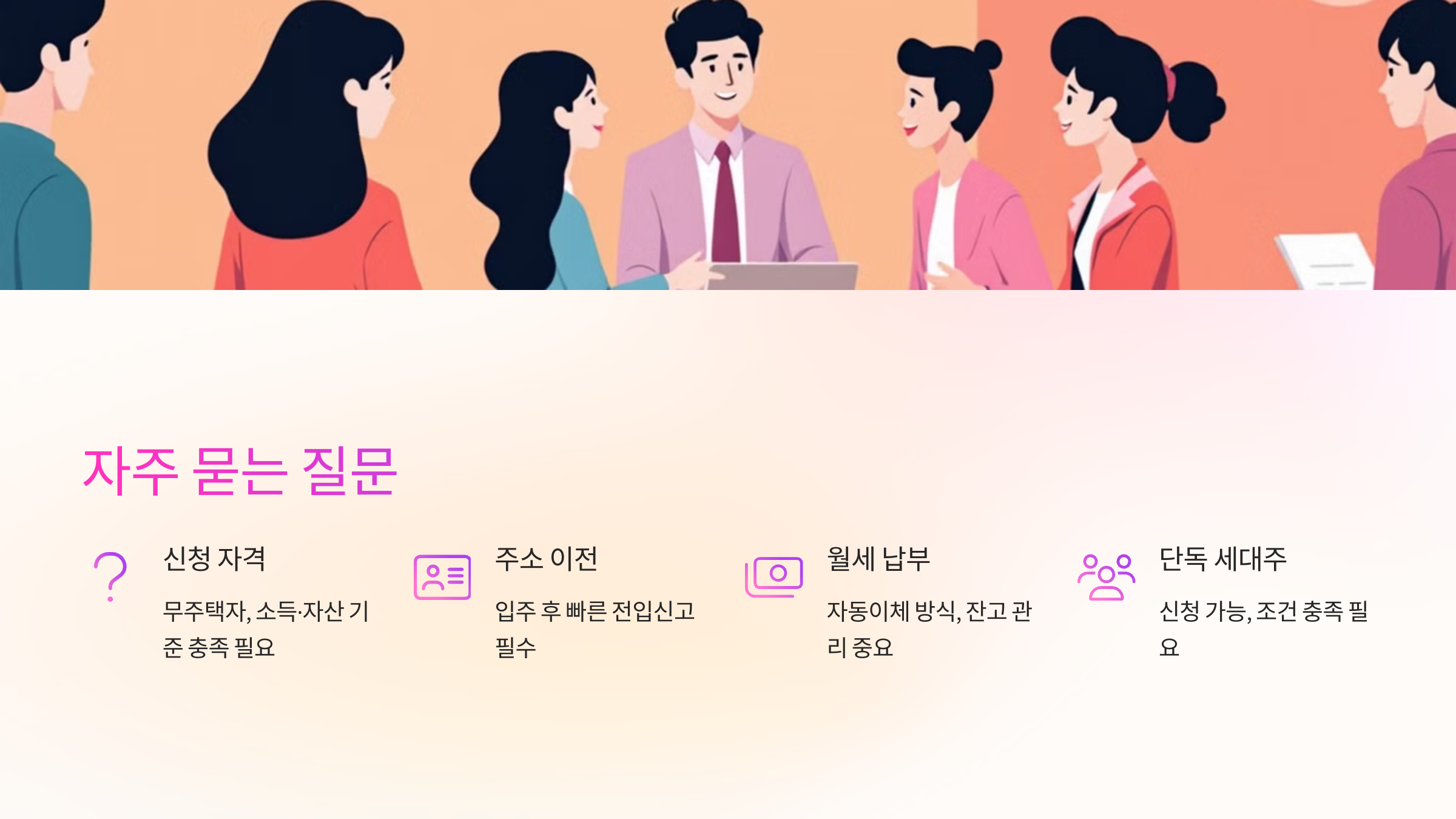 | 국민임대 | 무주택 서민 | 최대 30년 | 보증금+저렴한 월세 |
