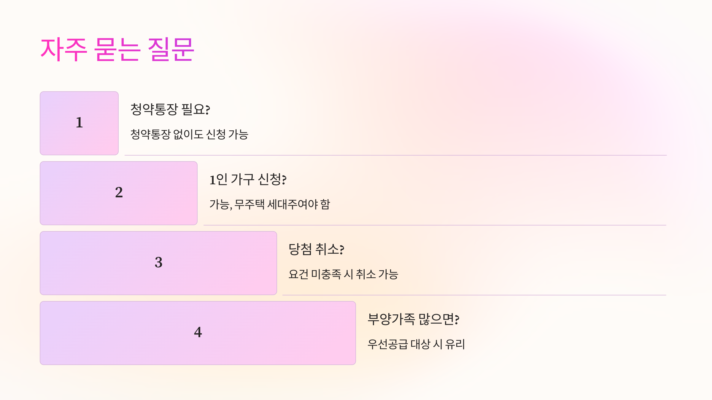 기존 주택청약과 달리 ‘청약 가점제’가 아닌 ‘우선순위제’가 적용돼요. 따라서 조건을 충족하는지 여부가 핵심이에요. 예비 입주자는 발표 후에도 일정 기간 내에 계약을 체결해야 하므로 기간도 잘 체크해야 해요.
