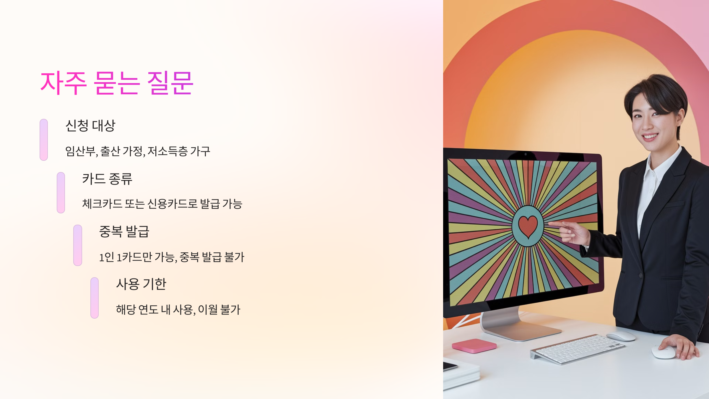 A1. 국민행복카드는 임산부, 출산 가정, 저소득층 가구 등 복지 서비스 대상자가 신청할 수 있어요. 본인이 지원 대상인지 확인 후 신청하세요!