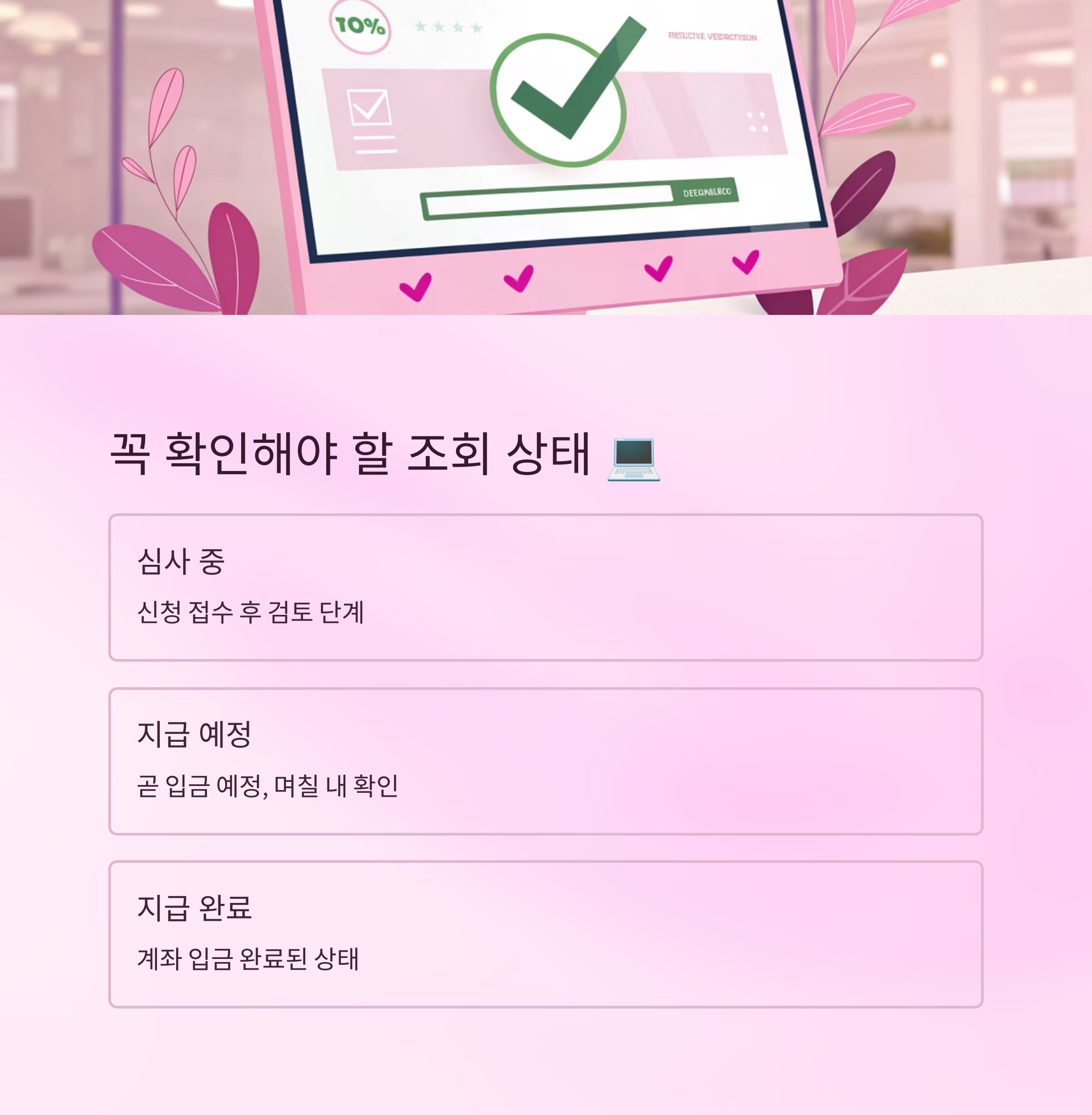 조회 시 가장 헷갈리는 점은 ‘지급 대기’, ‘심사 중’, ‘지급 예정’ 같은 상태가 바뀌는 과정이에요. ‘심사 중’ 단계에서는 아직 정확한 지급일이 정해지지 않은 상태고, ‘지급 예정’은 거의 확정된 상태라 며칠 내 입금이 이뤄진다고 보면 돼요.