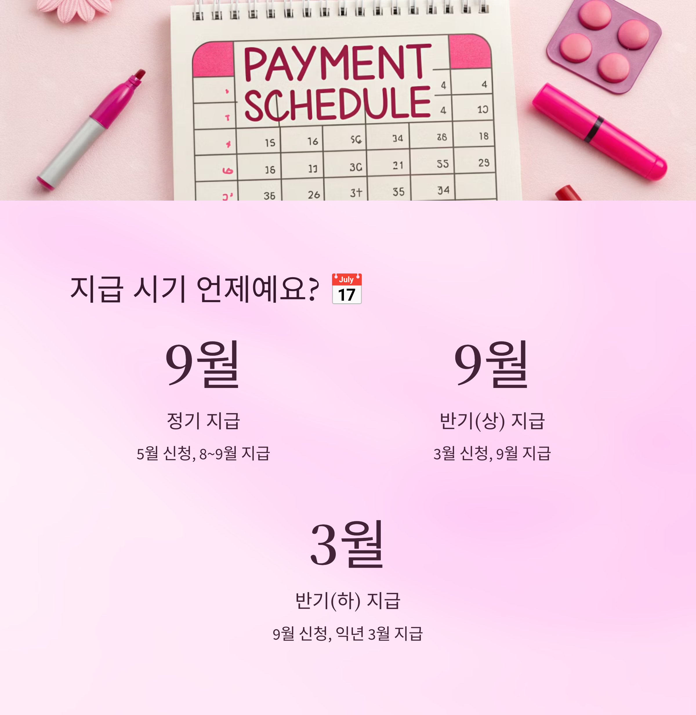 반기 지급은 상반기 소득을 기준으로 9월에, 하반기 소득을 기준으로 익년 3월에 지급돼요. 이를 위해 3월(상반기 신청), 9월(하반기 신청)에 각각 신청해야 해요. 신청 후 2~3개월 내에 지급 여부가 결정되죠.