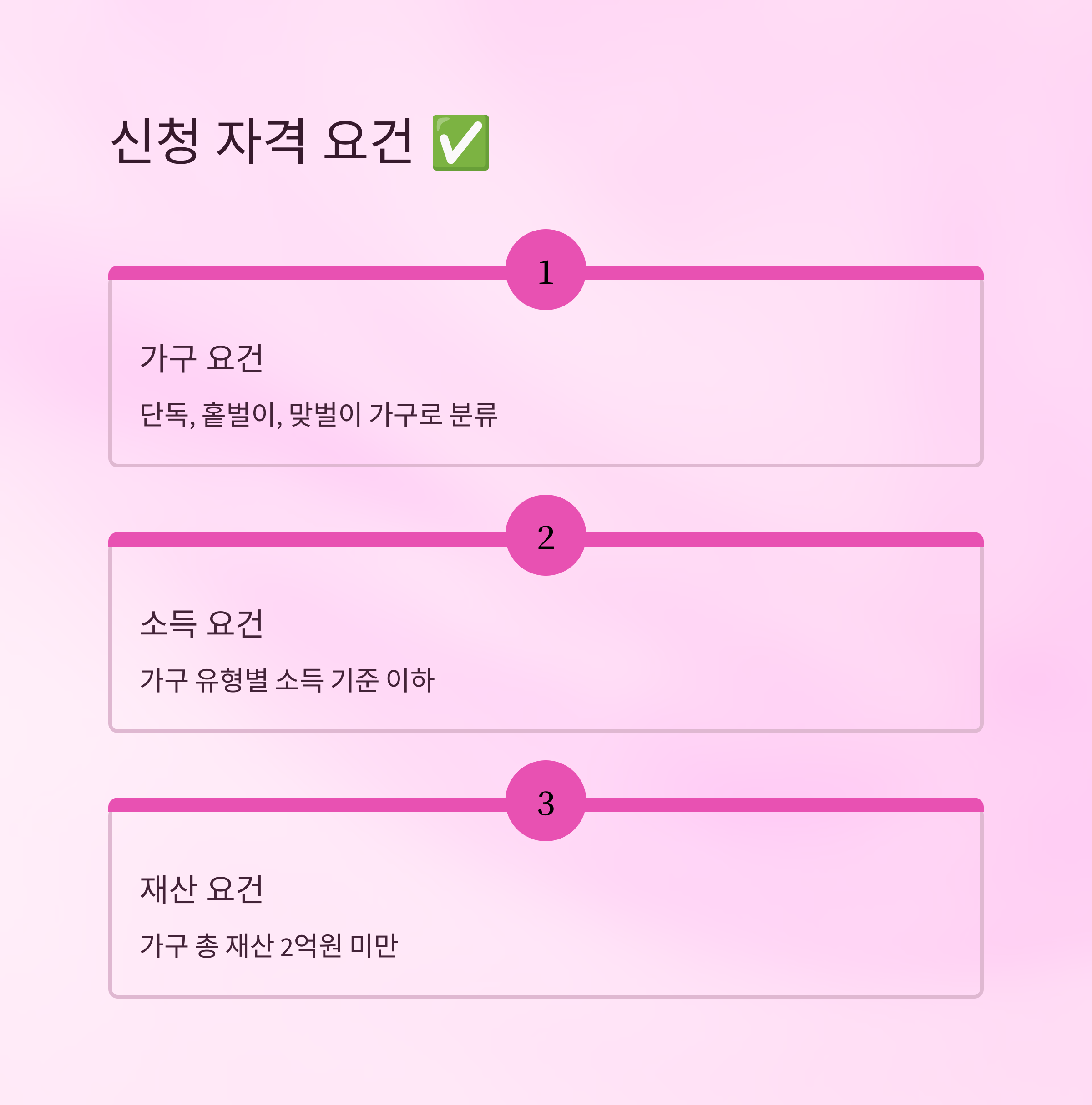 | 신청 전 | 가구, 소득, 재산 요건 확인 필수 |