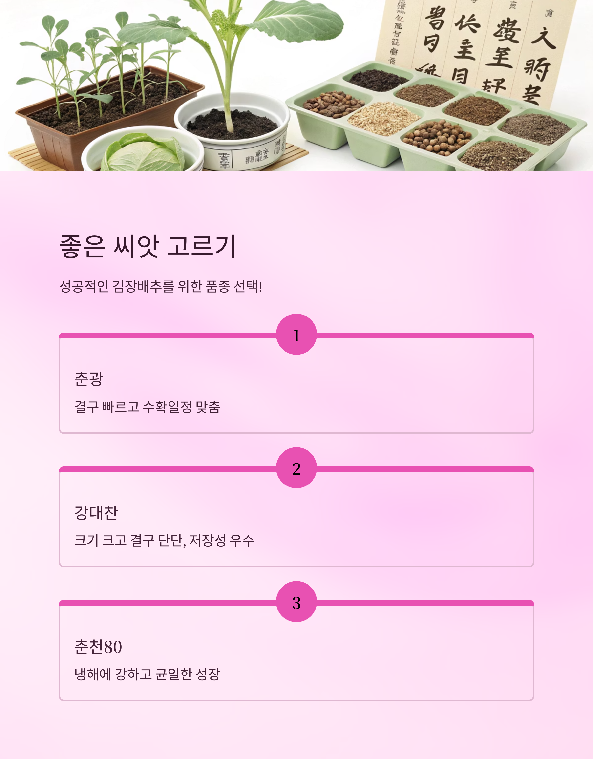 대표적인 품종으로는 '춘광', '춘천80', '강대찬', '화승추동' 등이 있어요. 각각의 특징이 다르니, 원하는 크기나 저장성, 수확 시기를 고려해서 고르면 좋아요. 저장용 배추는 겉잎이 단단하고 결구가 촘촘한 것이 좋고, 바로 먹을 배추는 식감이 부드러운 게 잘 맞아요.