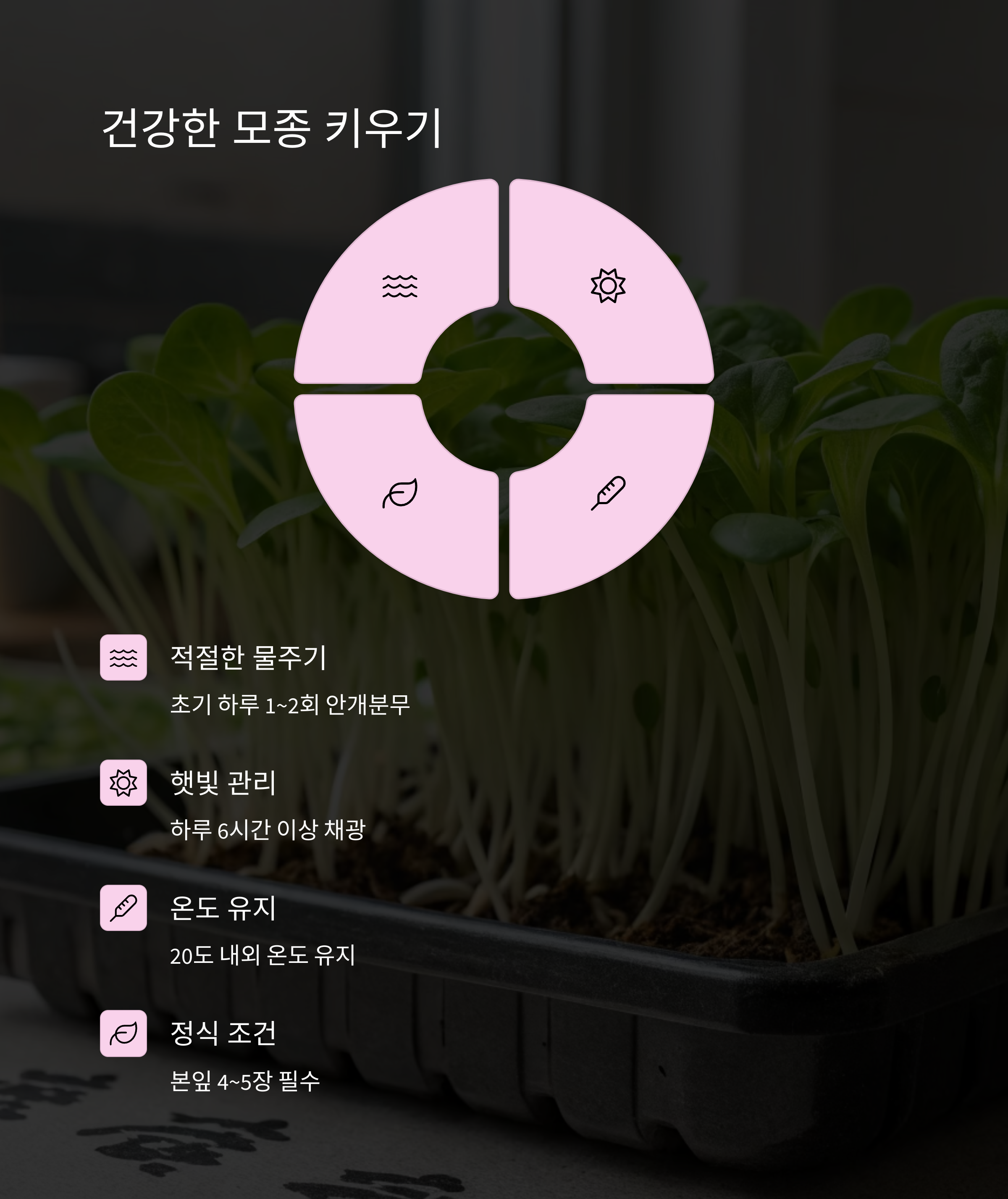 파종 후에는 햇빛과 통풍이 잘 되는 곳에서 키워야 건강한 모종이 자라요. 실내에서 키울 경우 하루 6시간 이상은 햇빛을 받아야 하고, 비닐하우스에서는 온도를 20도 내외로 유지하면 아주 좋답니다. 환기도 가끔 시켜줘야 곰팡이 발생도 줄일 수 있어요.🌤️