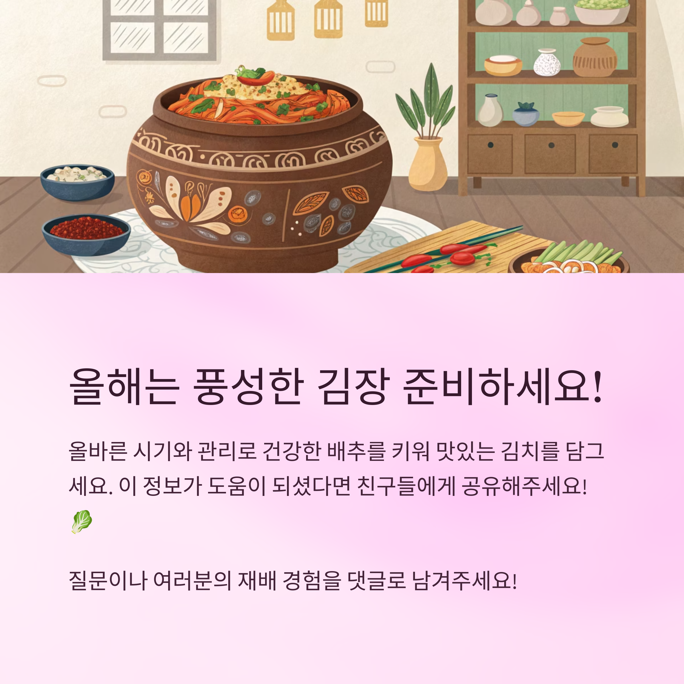 📌 본 글은 일반적인 김장배추 재배 방법을 소개하는 정보성 콘텐츠이며, 모든 재배 환경이나 품종에 따라 결과가 달라질 수 있습니다. 지역 기후, 토양, 병해충 발생 조건에 따라 적용이 다를 수 있으니 참고용으로 활용해 주세요.