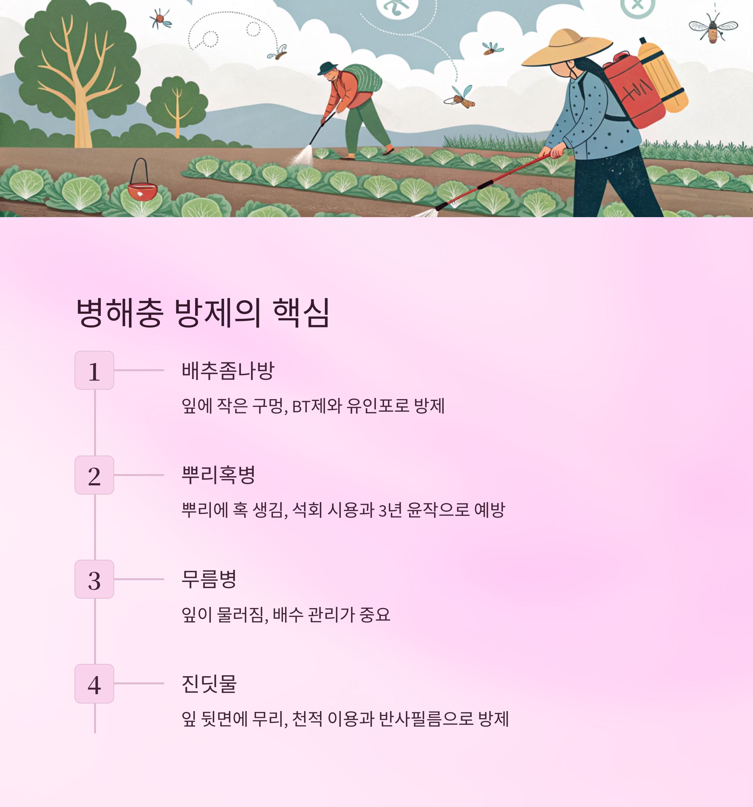 병으로는 무름병, 뿌리혹병, 노균병 등이 있어요. 무름병은 주로 비가 자주 오는 여름 끝자락에 발생하고, 잎이 물러지고 썩는 증상이 보여요. 뿌리혹병은 뿌리에 혹이 생기면서 배추가 제대로 자라지 않고 시들기 때문에 토양 소독과 윤작이 가장 중요해요.