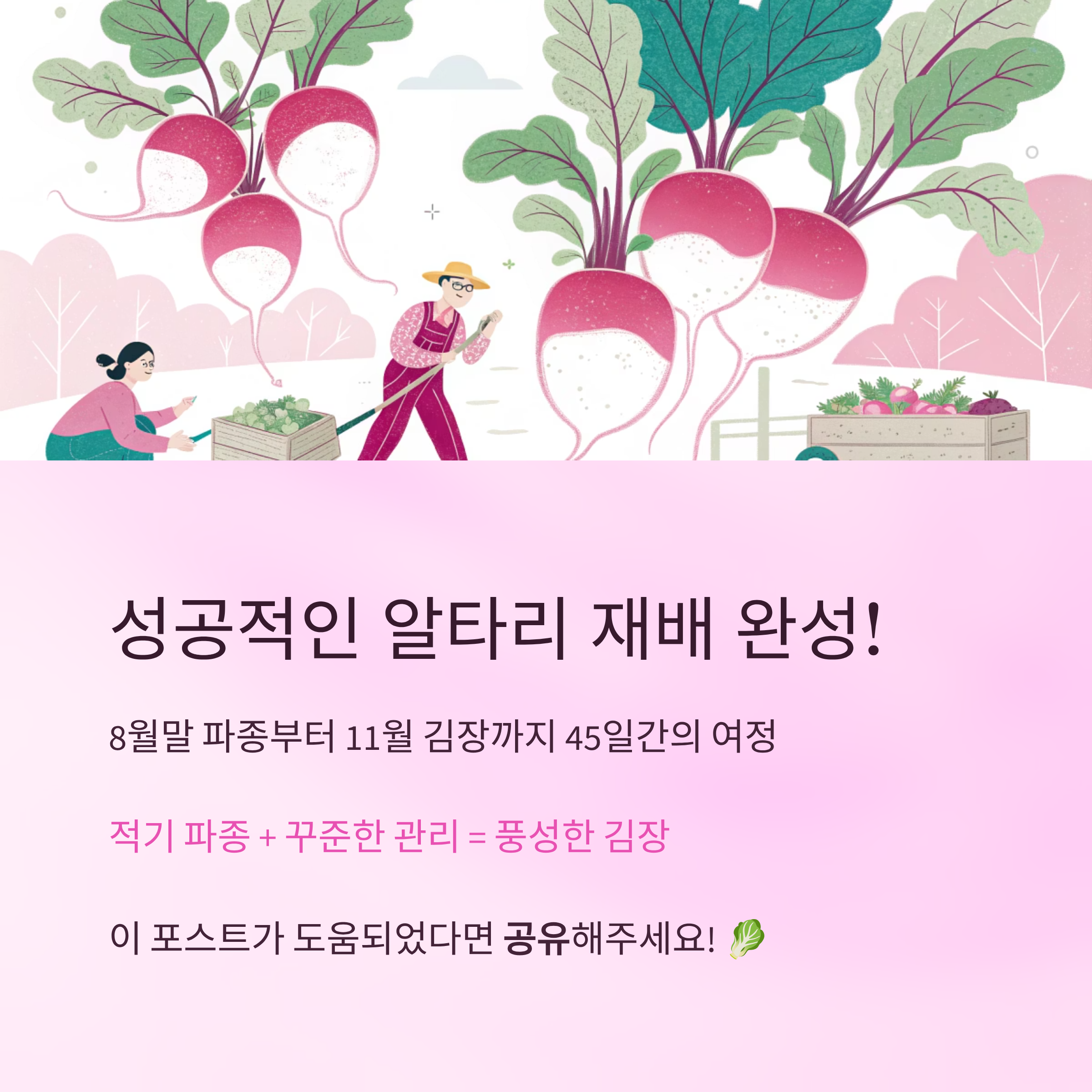 이렇게 활용도가 높은 알타리무는 직접 재배해서 활용하면 훨씬 더 신선하고 풍성한 김장을 만들 수 있어요. 재배만 잘하면 정말 든든한 식재료가 된답니다. 🥰
