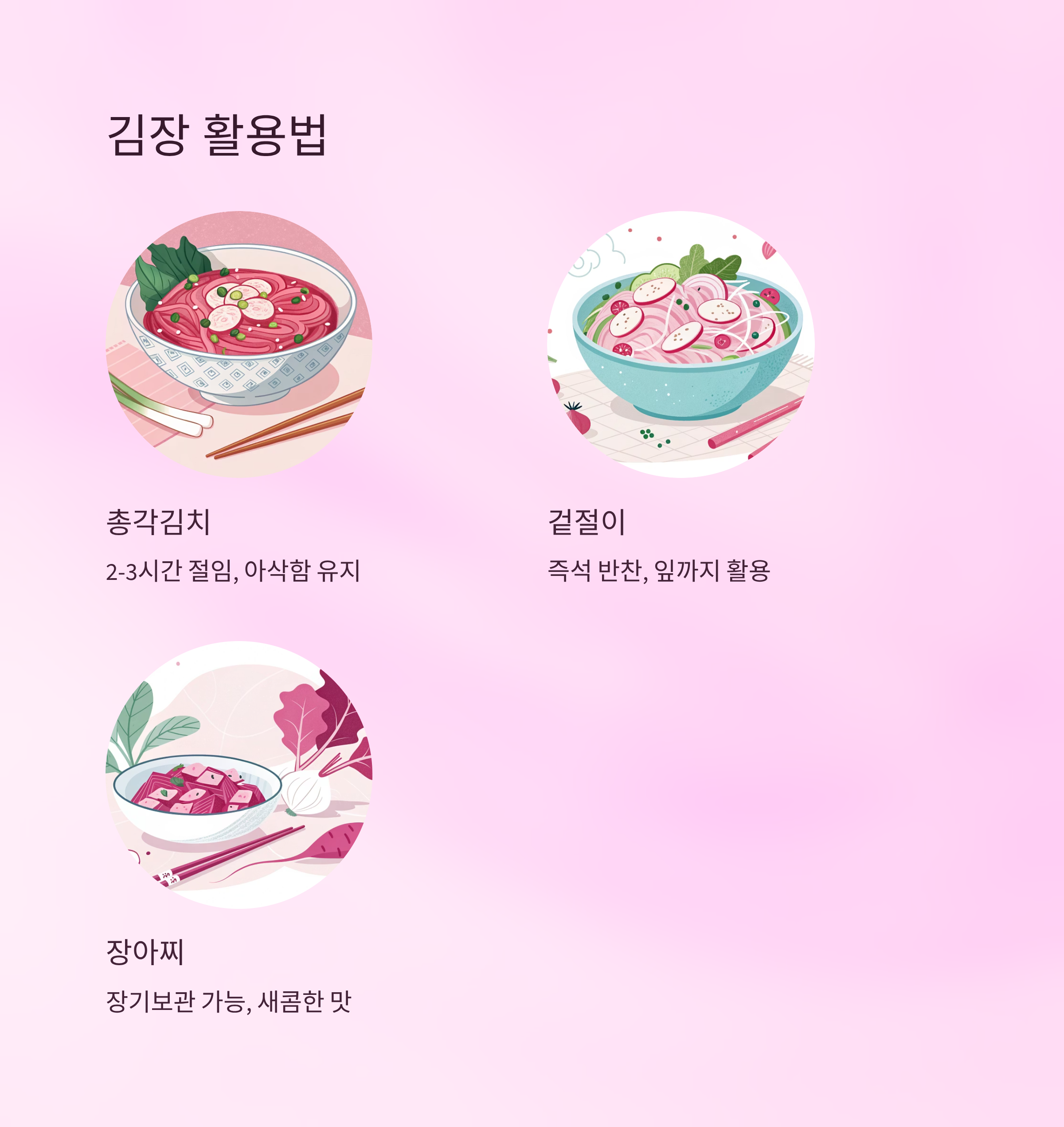 김장용으로 사용할 경우에는 깨끗이 씻어 잔뿌리를 정리한 후, 줄기와 뿌리를 그대로 사용해요. 총각김치나 섞박지에 주로 사용되며, 아삭한 식감 덕분에 겉절이용으로도 최고예요.