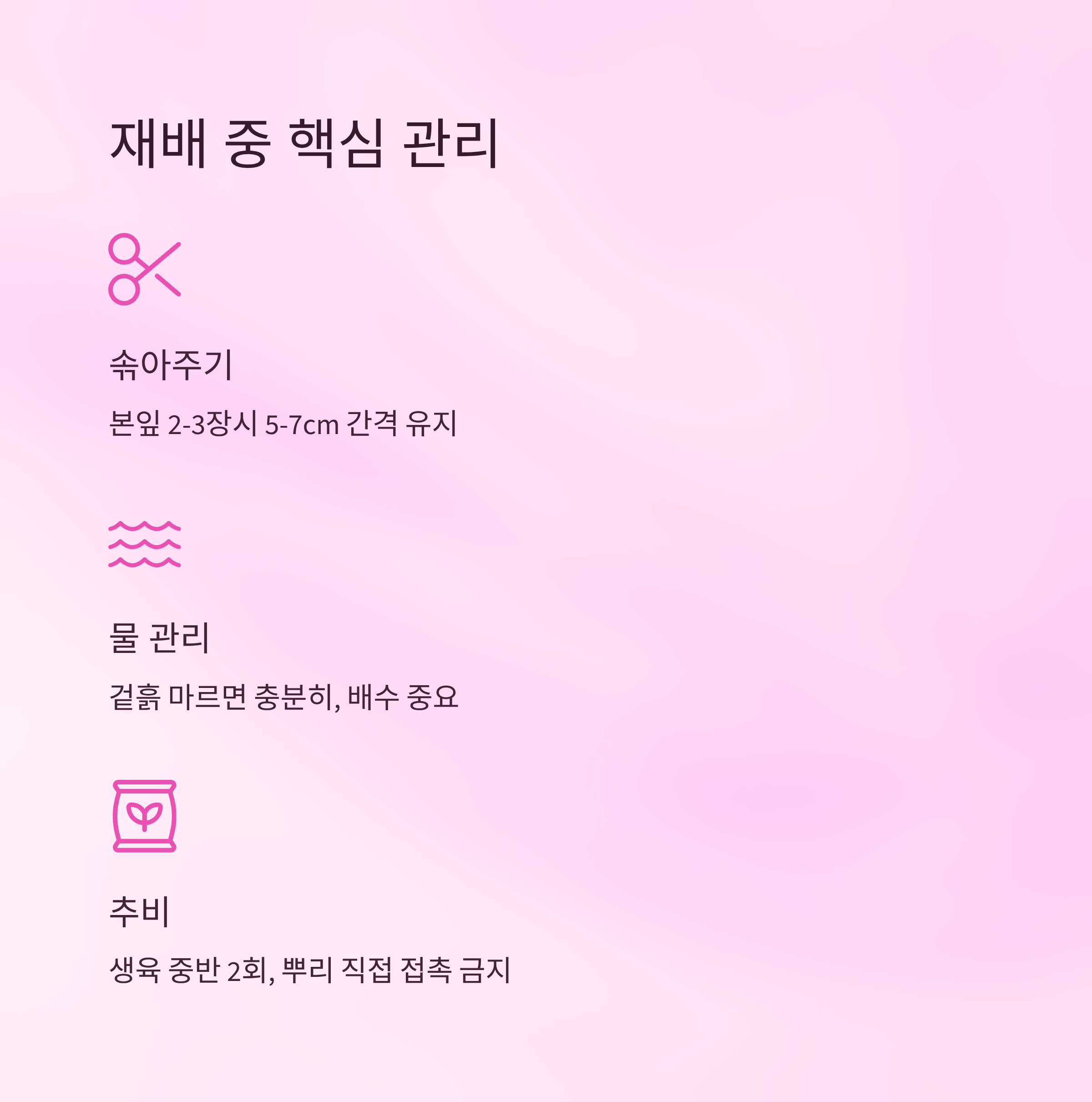 | 솎아주기 | 본잎 2~3장 시 | 5~7cm 간격 유지 |