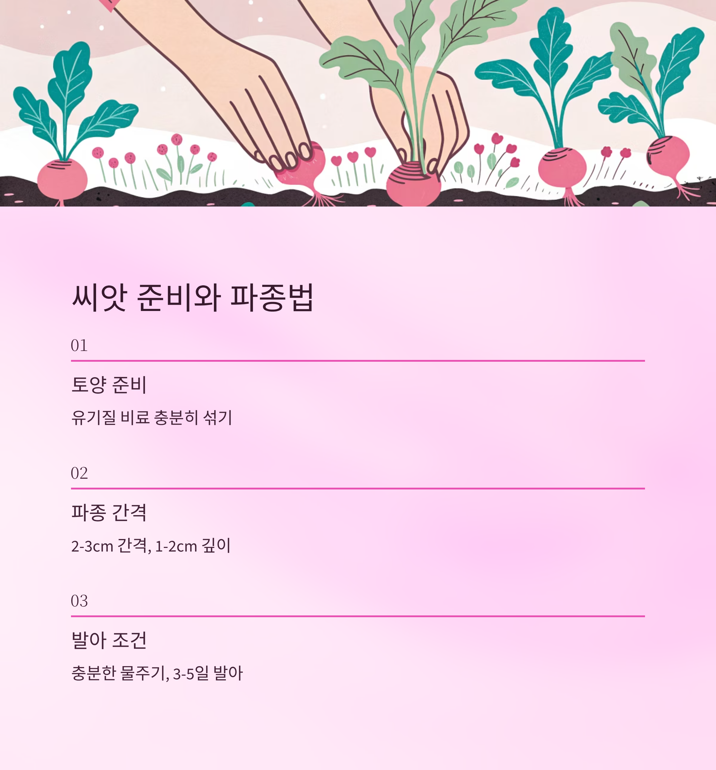 파종 전에는 땅을 고르게 다듬고, 유기질 비료를 충분히 섞어주는 게 좋아요. 알타리는 뿌리를 키우는 작물이기 때문에 토양 깊숙이까지 부드럽게 갈아주는 것이 중요하답니다.