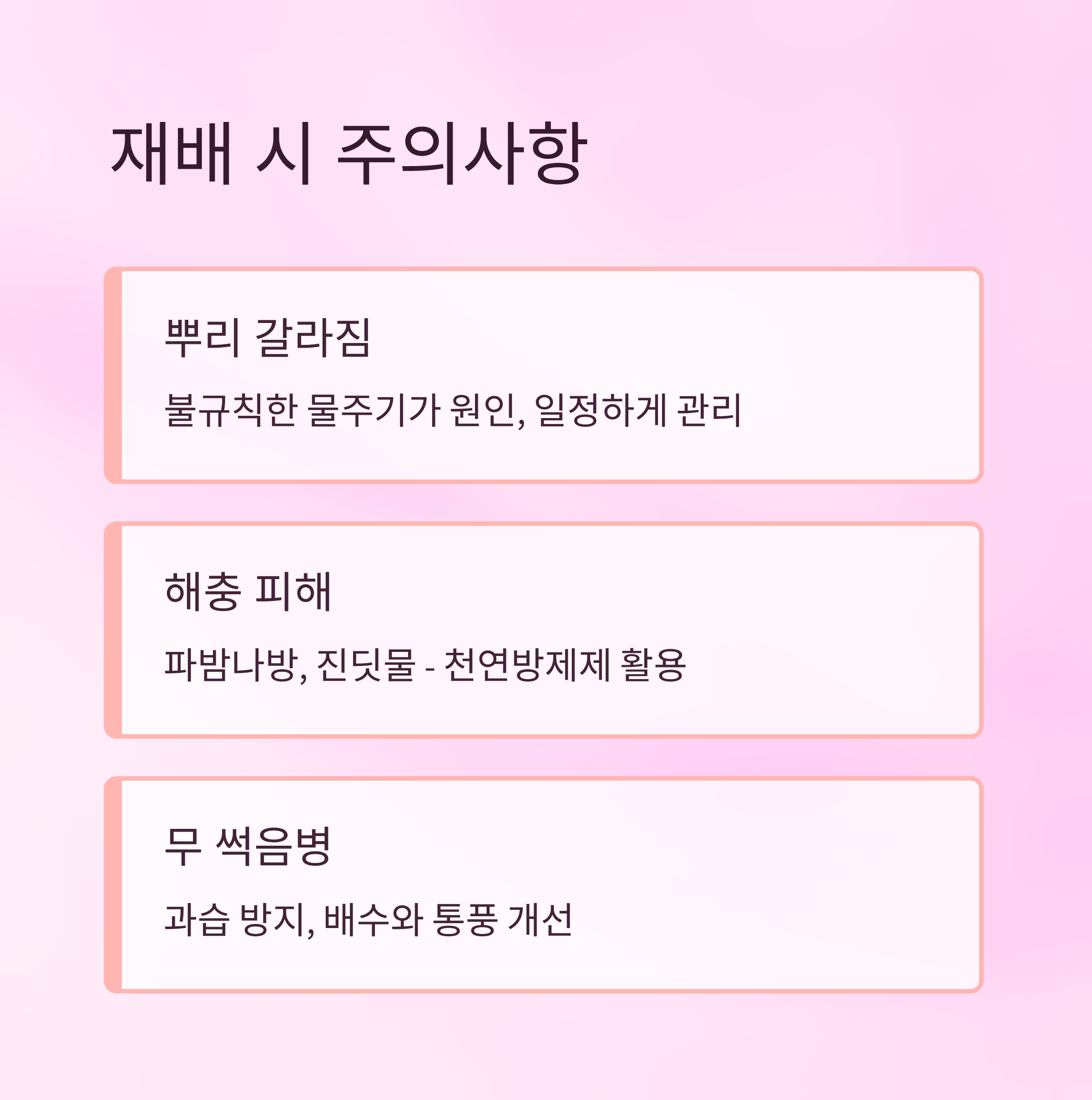 | 무 썩음병 | 과습 또는 통기 불량 | 배수 개선, 환기 확보 |