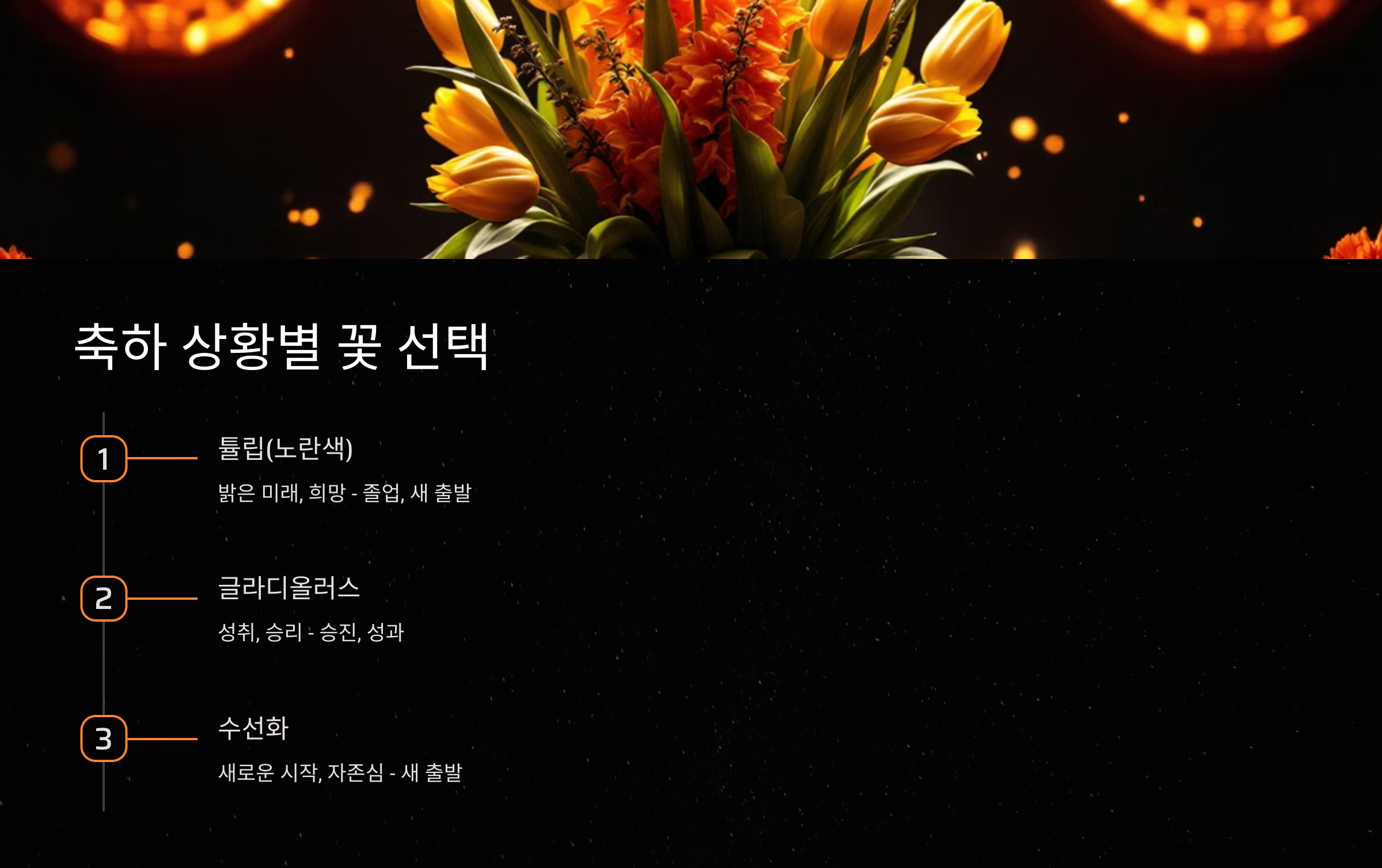 노란 튤립과 글라디올러스를 섞어 축하 꽃다발을 준비하세요. *"밝은 미래와 성공을 응원합니다."*라는 메시지를 더해보세요.