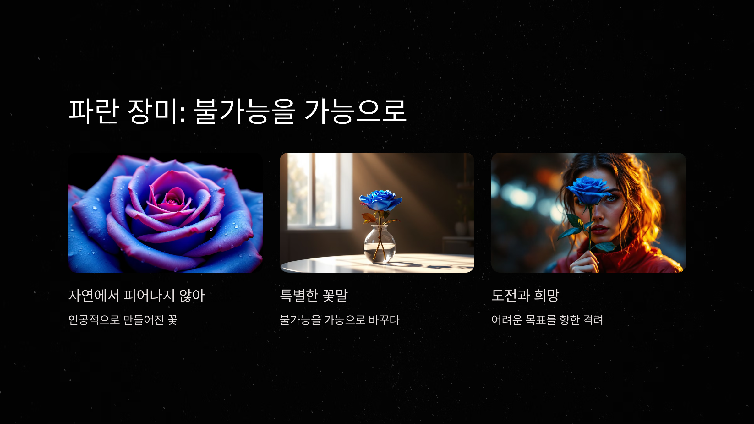 파란 장미는 자연에서 자라는 것이 아닌 인공적으로 만들어진 꽃입니다.