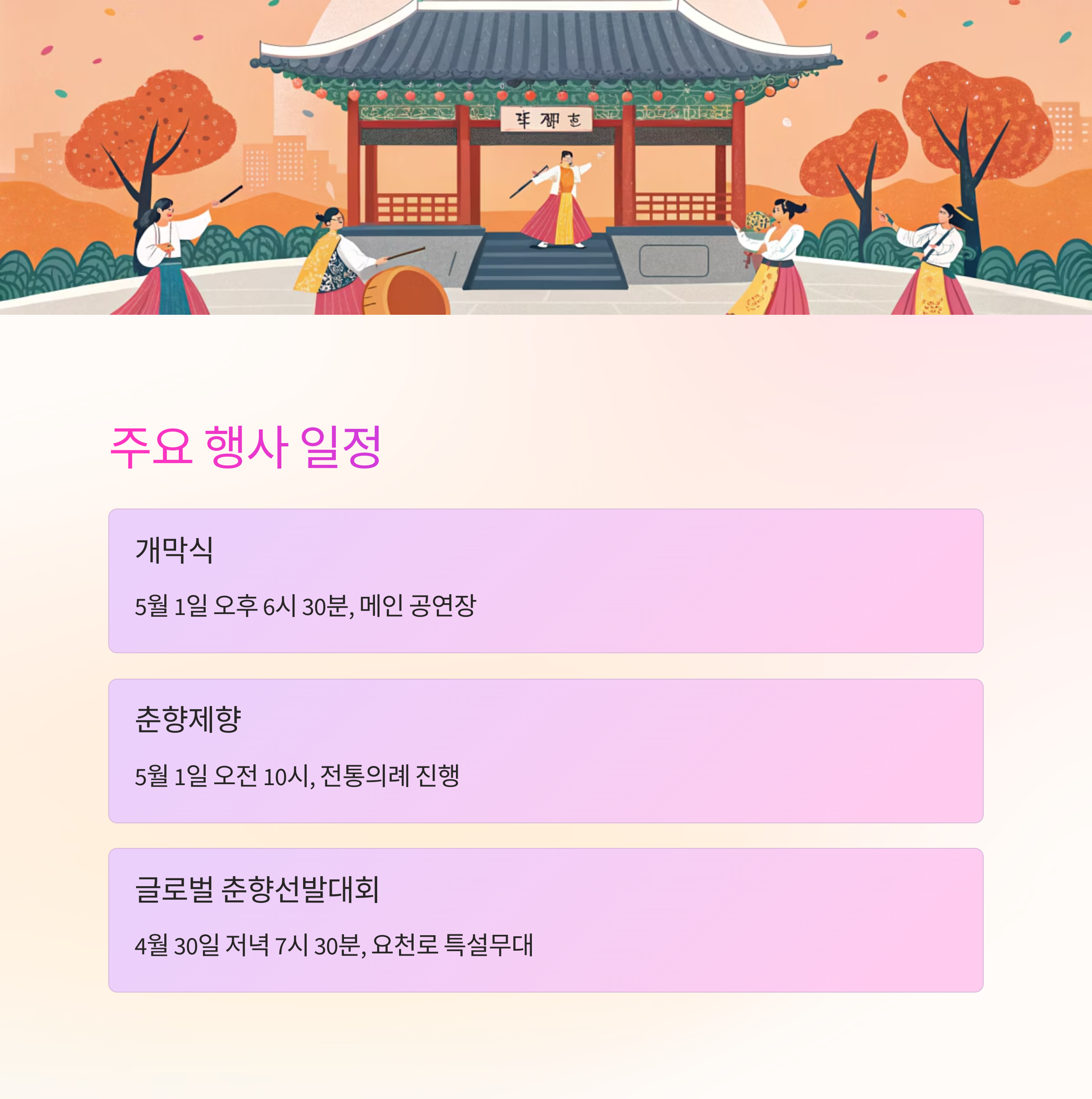 초대가수 공연 외에도 다양한 공식 행사가 함께 열려요. 특히 개막식과 폐막식, 전통 제향행사, 글로벌 춘향선발대회 본선은 관람 포인트로 손꼽힌답니다. 이런 행사들은 축제의 전통적 의미와 대중적 재미를 동시에 제공해줘요.