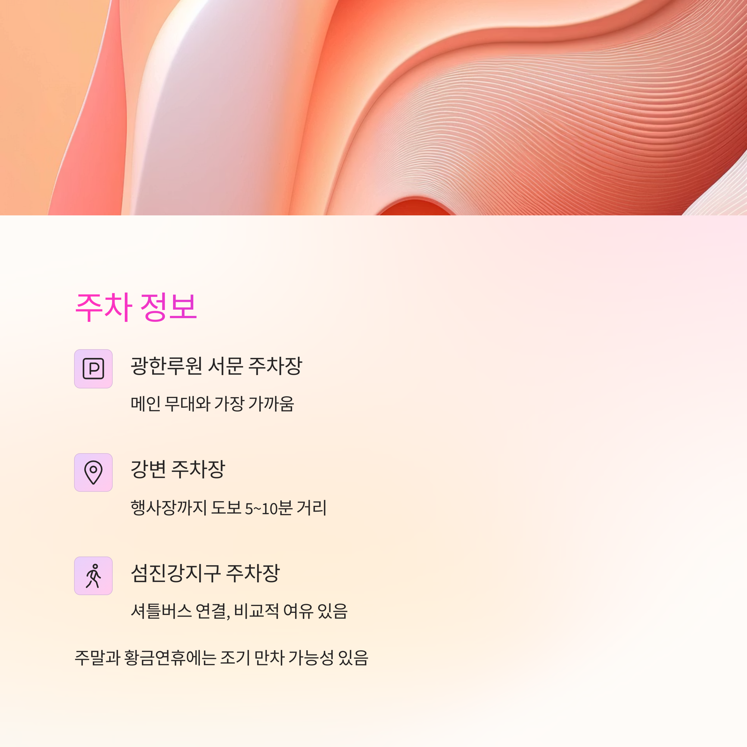 또한, 주차장과 행사장을 잇는 셔틀버스 정류장이 있어 이동이 편리하다는 점도 장점이에요. 이동시간을 단축하고 싶다면 평일 낮 시간대를 활용하는 것도 꿀팁이에요!