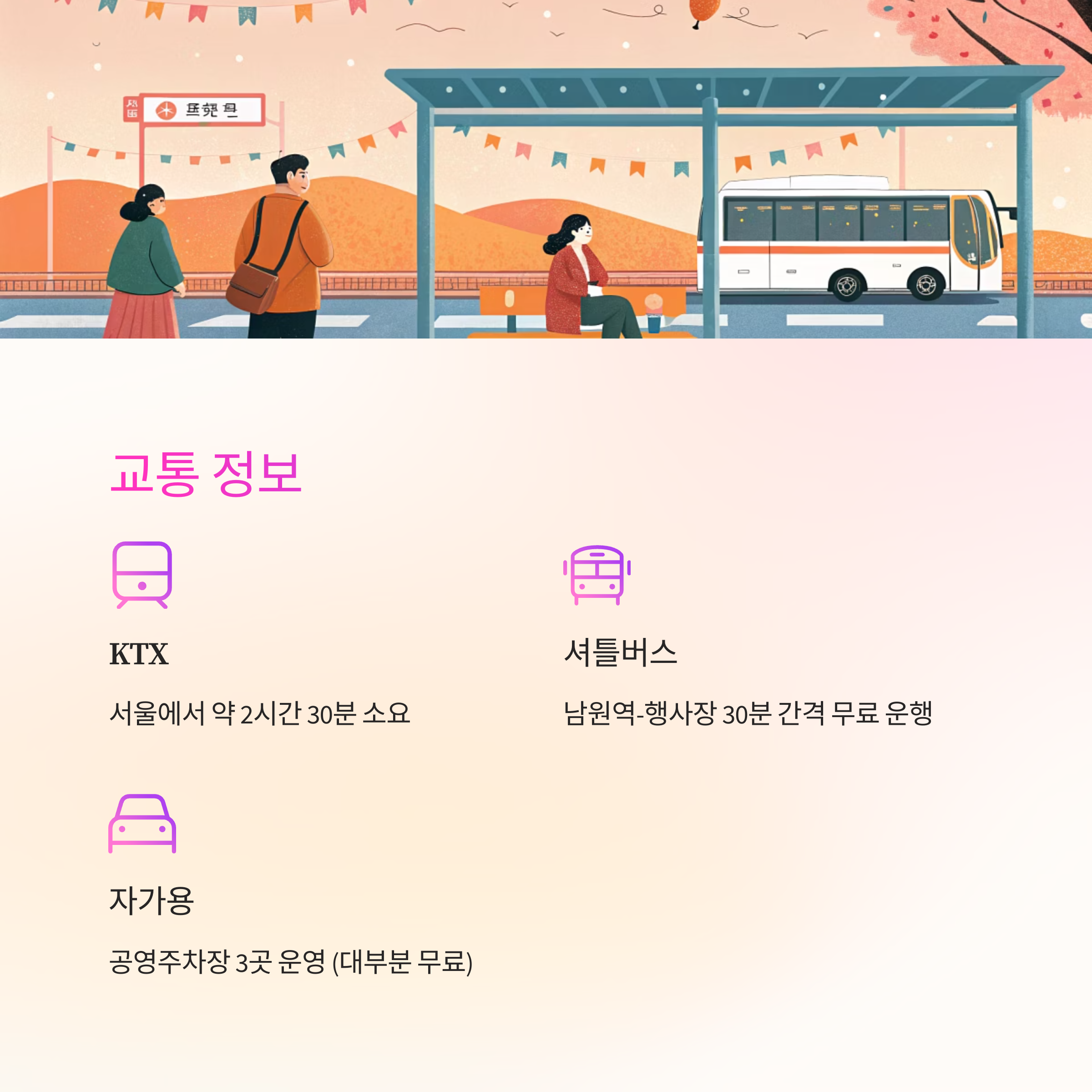 행사기간 중에는 남원역과 행사장 사이를 오가는 무료 셔틀버스가 30분 간격으로 운행돼요. 셔틀버스는 남원역 앞 버스 승강장에서 탈 수 있고, 요천변과 광한루원 인근 행사장 주요 지점에 하차할 수 있어요. 이동 동선이 길지 않아서 걸어서도 금방 도착할 수 있답니다.