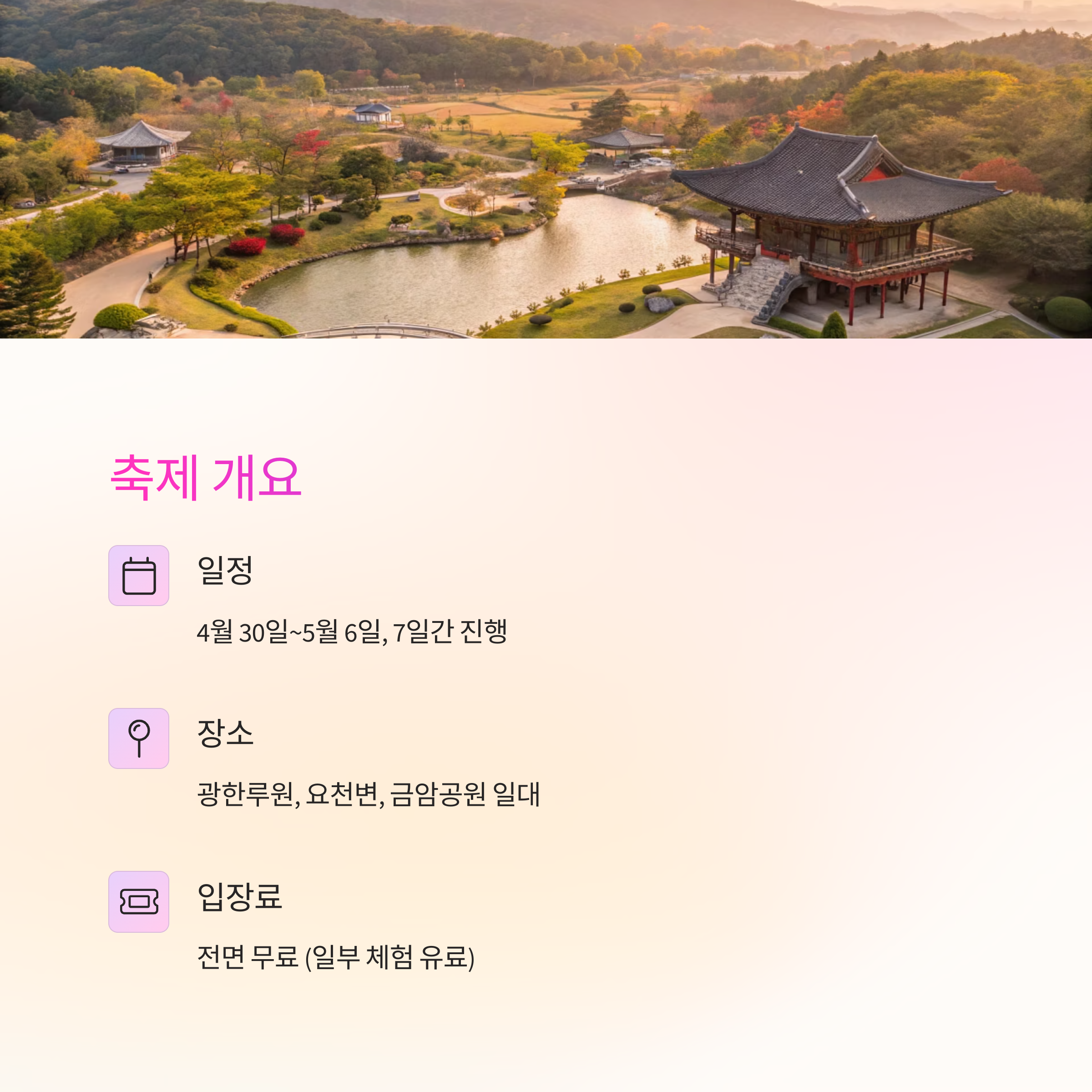 축제 장소는 전라북도 남원시의 상징인 광한루원과 요천변, 그리고 금암공원 일대예요. 시민들과 관광객들이 부담 없이 즐길 수 있도록 대부분의 공연은 무료로 진행되고, 일부 유료 체험도 준비되어 있답니다.