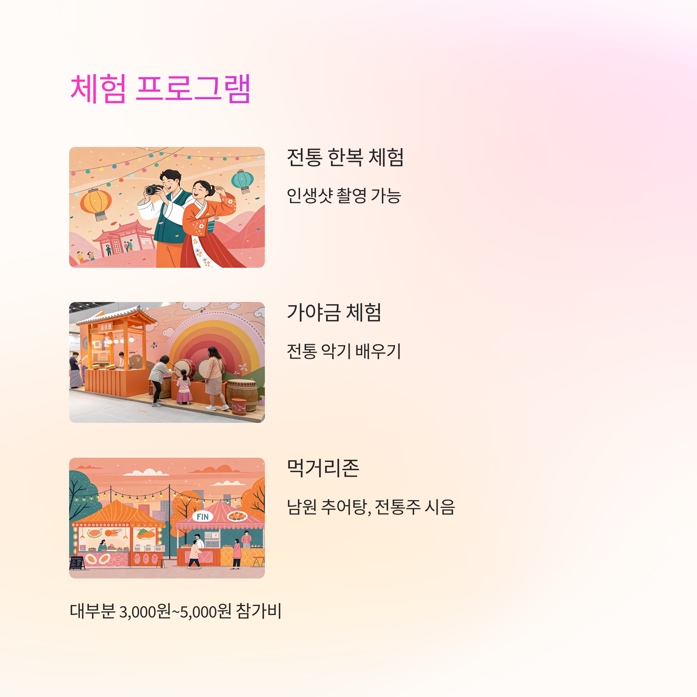 춘향제는 단순한 무대 공연뿐 아니라 관객이 직접 참여할 수 있는 체험 프로그램도 풍성해요. 전통 한복 체험, 춘향 스티커 만들기, 전통혼례 리마인드 촬영, 가야금 체험 등 아이들과 함께하거나 친구끼리 즐기기 좋은 체험들이 준비되어 있답니다.
