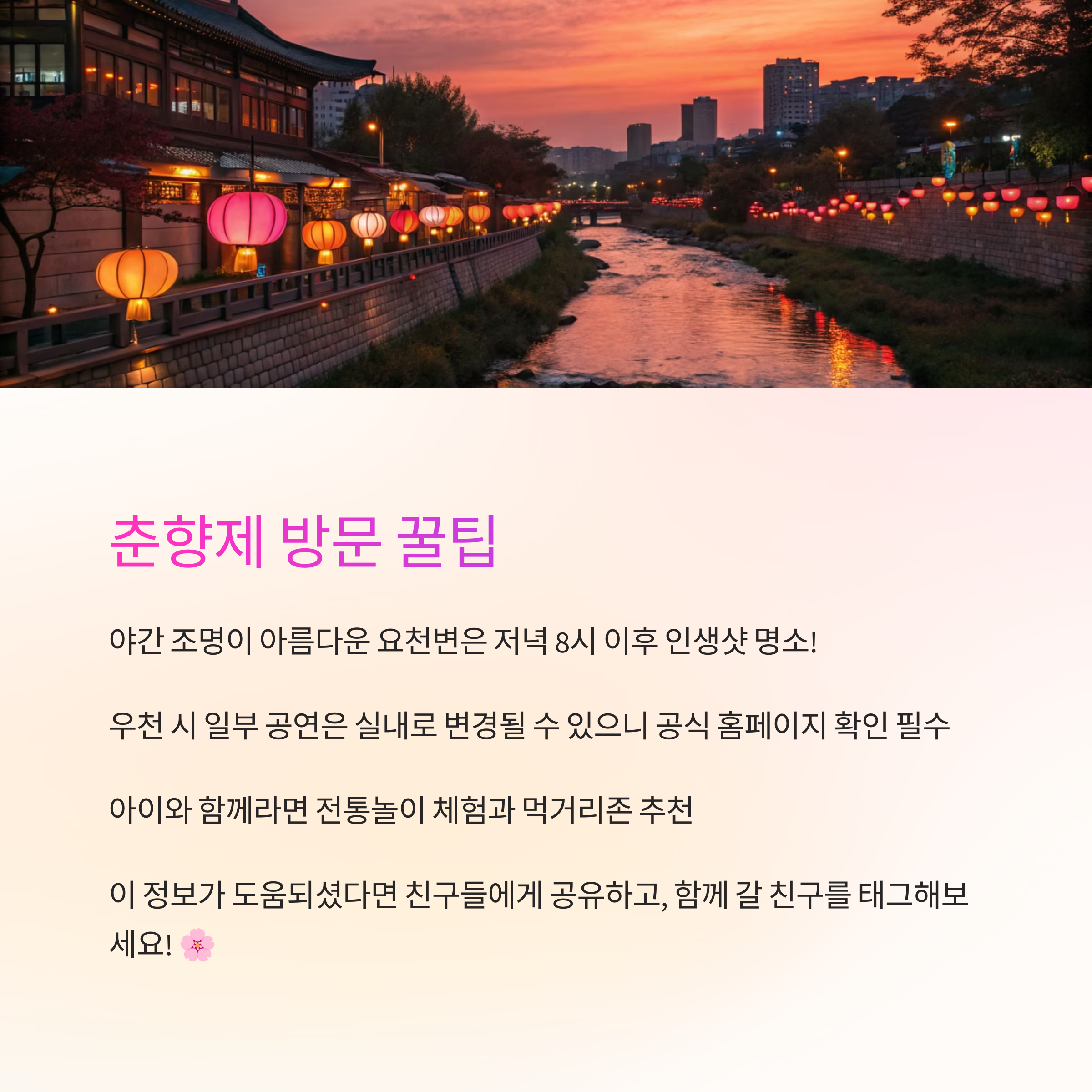 밤에는 조명으로 물든 요천변과 광한루원이 아름답게 꾸며져서 야간 산책 코스로도 인기 많아요. 인생샷을 건지고 싶다면 저녁 8시 이후를 노려보세요 📸