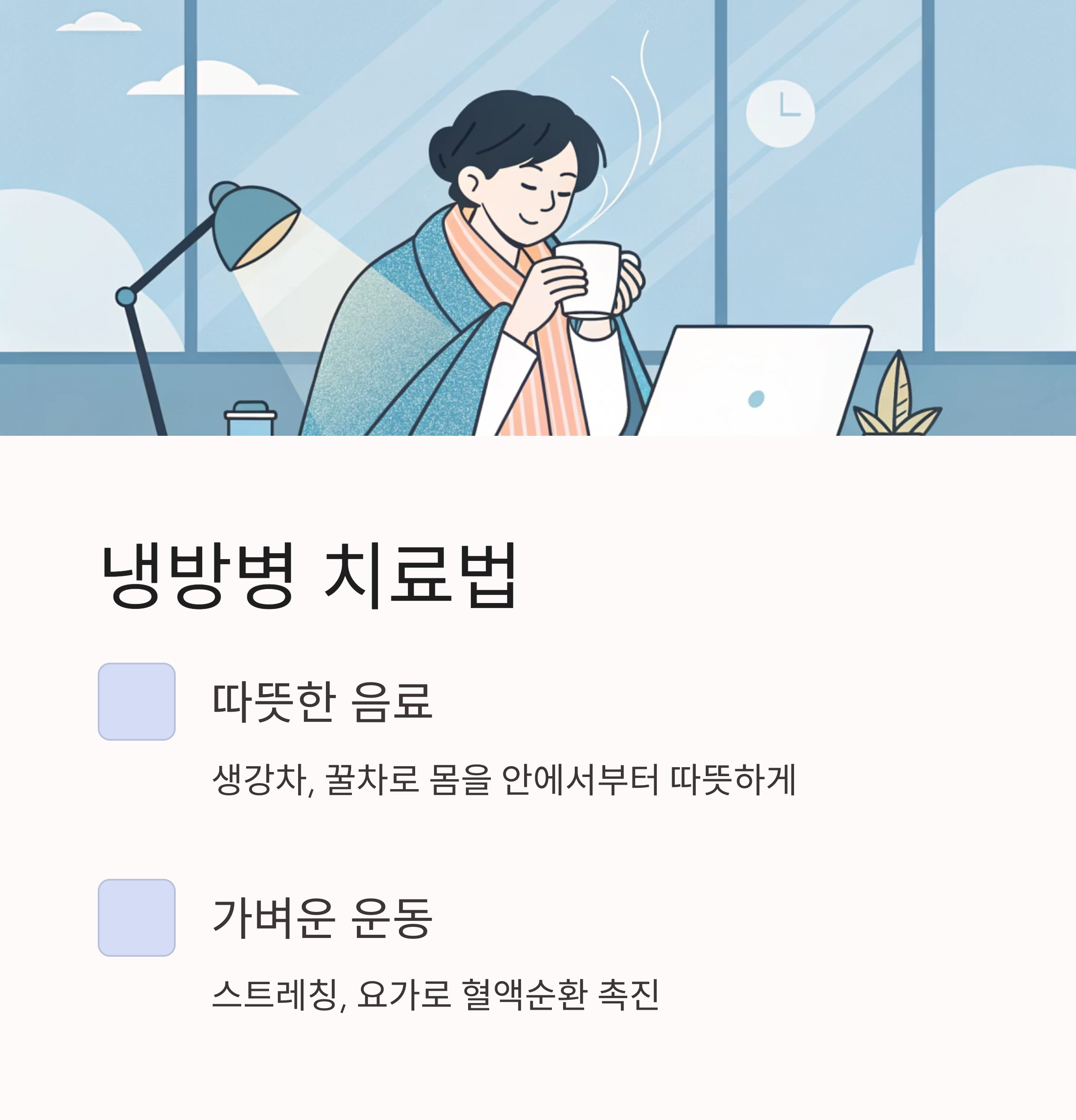냉방병의 치료는 원인을 제거하고 몸의 자연 회복력을 돕는 방향으로 진행돼요. 가장 먼저 할 일은 실내 온도를 적절하게 유지하고 찬 바람이 직접 몸에 닿지 않도록 환경을 조절하는 거예요. 가능하면 에어컨 바람이 직접 오지 않도록 자리 이동이나 가림막을 사용하는 것도 좋아요.