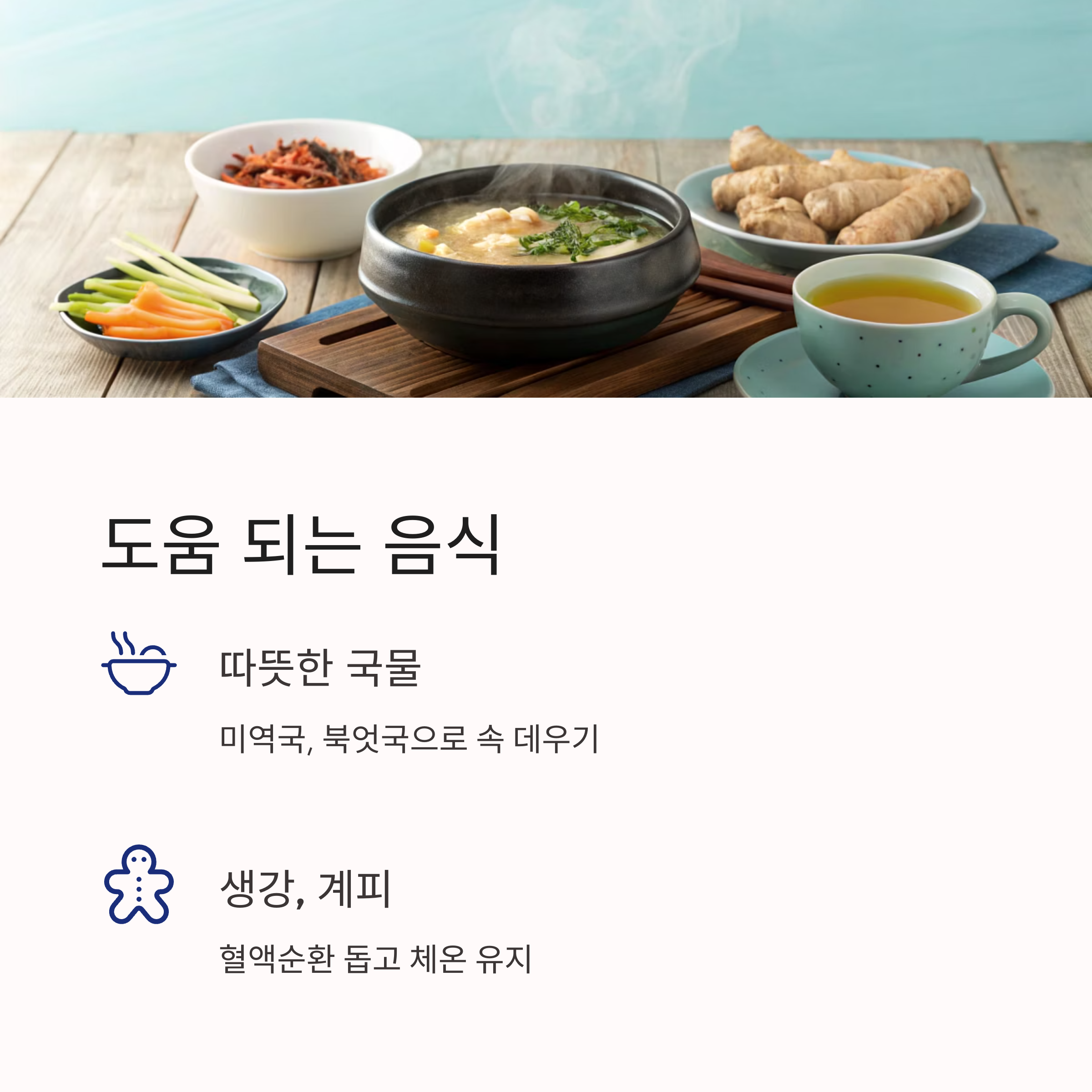 가장 기본이 되는 음식은 따뜻한 국물요리예요. 미역국, 북엇국, 된장국처럼 속을 덥히고 소화에 부담 없는 국이 좋아요. 특히 미역에는 요오드 성분이 있어 자율신경 안정에도 도움을 줄 수 있어요.