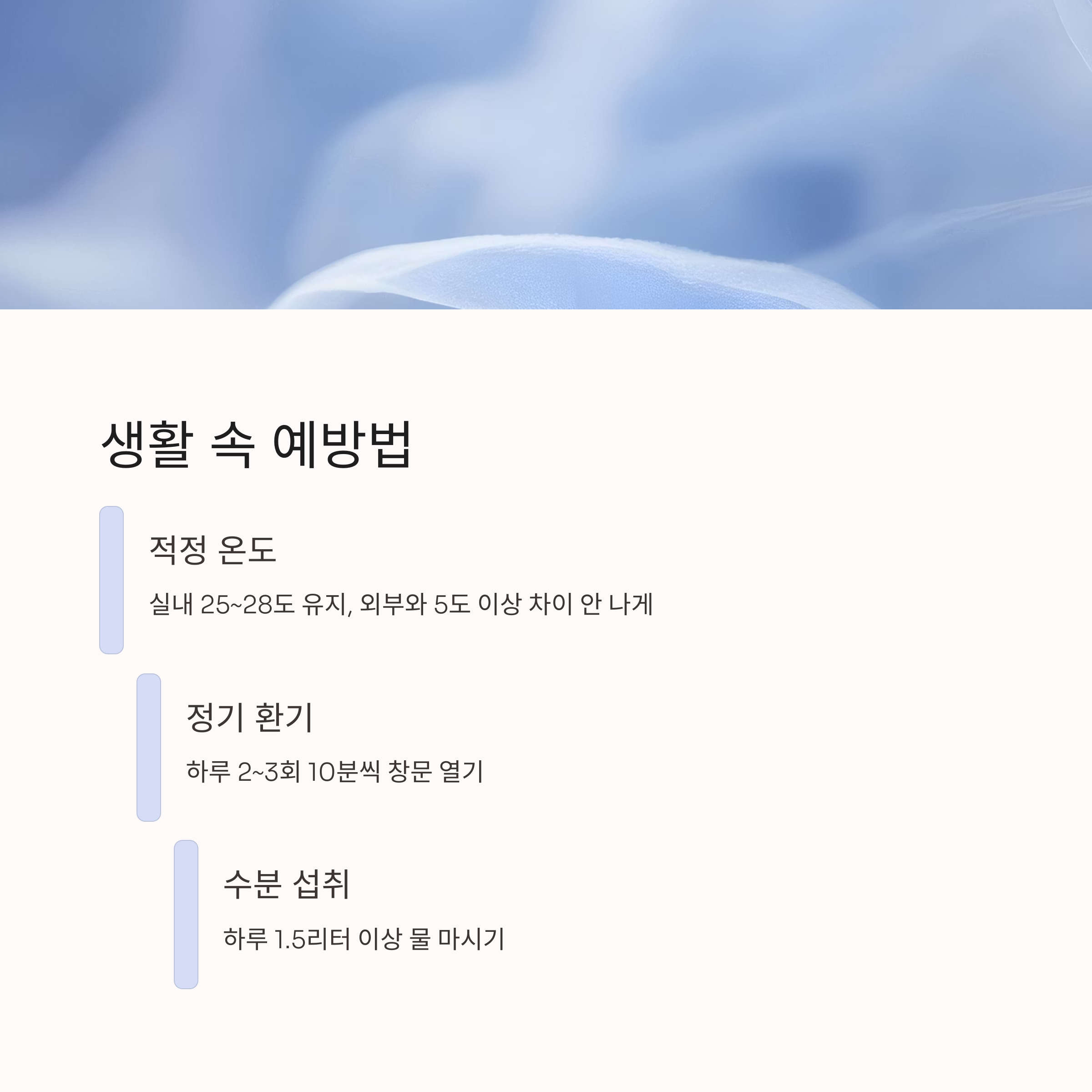 요약하자면, 냉방병은 ‘기온차이 + 개인의 면역력 저하 + 환기 부족’이라는 삼박자가 맞을 때 발생하기 쉬워요. 따라서 여름철 실내 환경을 잘 관리하는 것이 중요해요. 😊