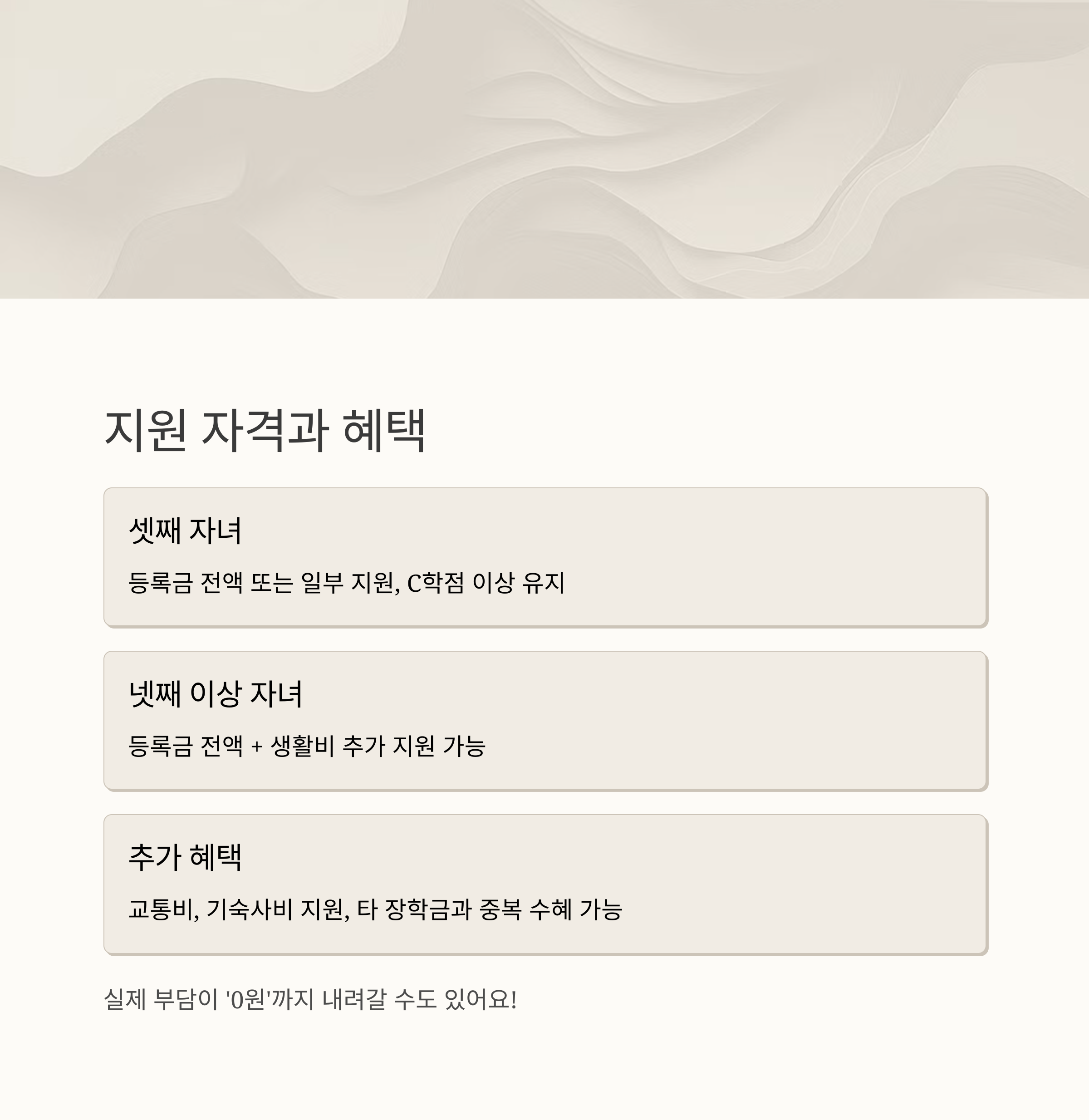 기본적으로 둘째부터 시작해 셋째 이상인 자녀에게 집중적으로 지원되며, 등록금 전액 지원도 가능한 매우 실질적인 장학금이에요. 일반 장학금과 다르게 성적 조건도 낮은 편이라 접근성이 좋아요. 특히 지방 거주자나 다문화 가정도 별도 혜택을 받을 수 있어요.