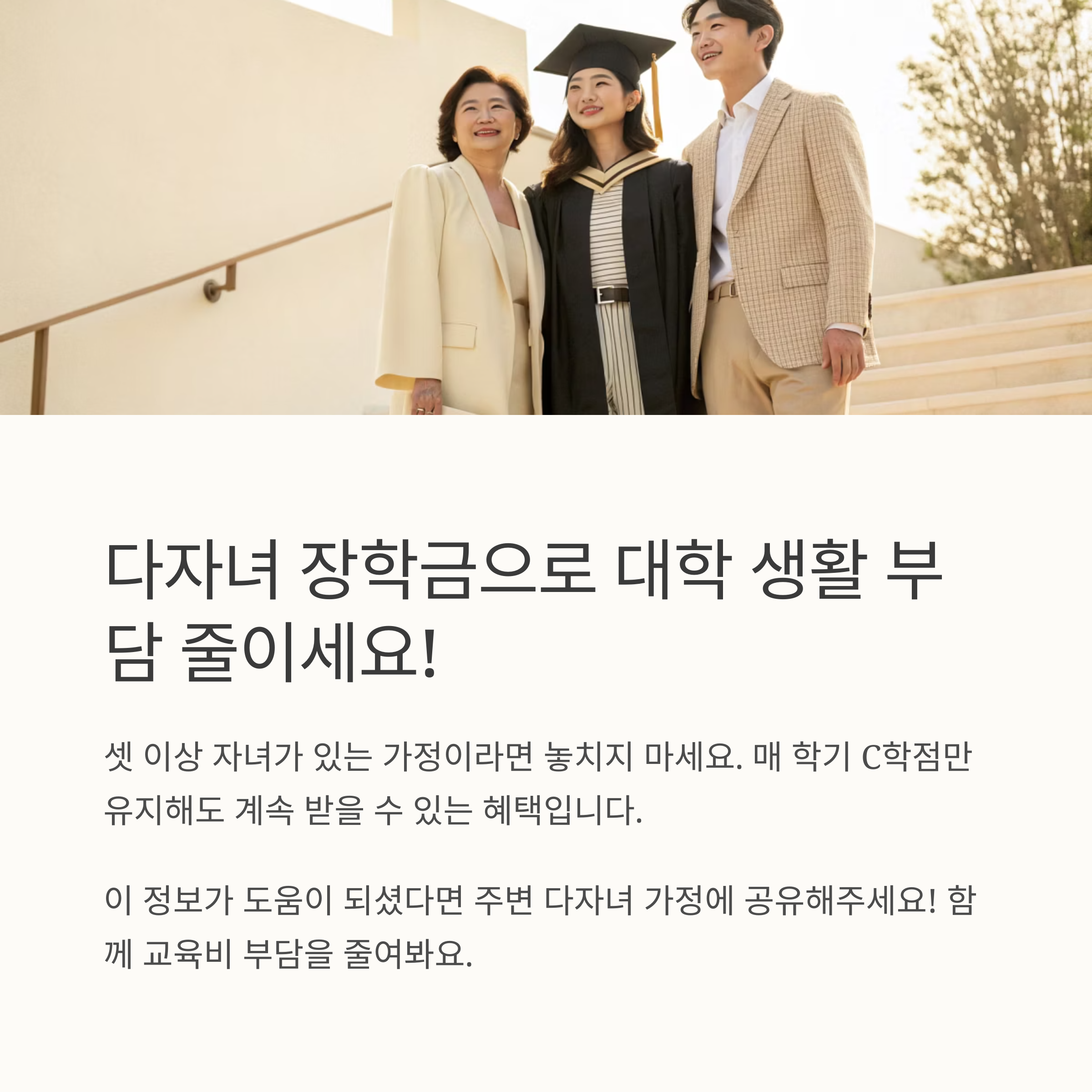 이처럼 다자녀 장학금은 그 조건이 까다롭지 않고, 실질적인 혜택이 커서 셋 이상의 자녀를 둔 가정에게는 절대 놓쳐서는 안 될 기회예요! 다자녀 부모님이라면 꼭 자녀에게 알려주시고, 직접 신청도 도와주시는 게 좋아요. 😊