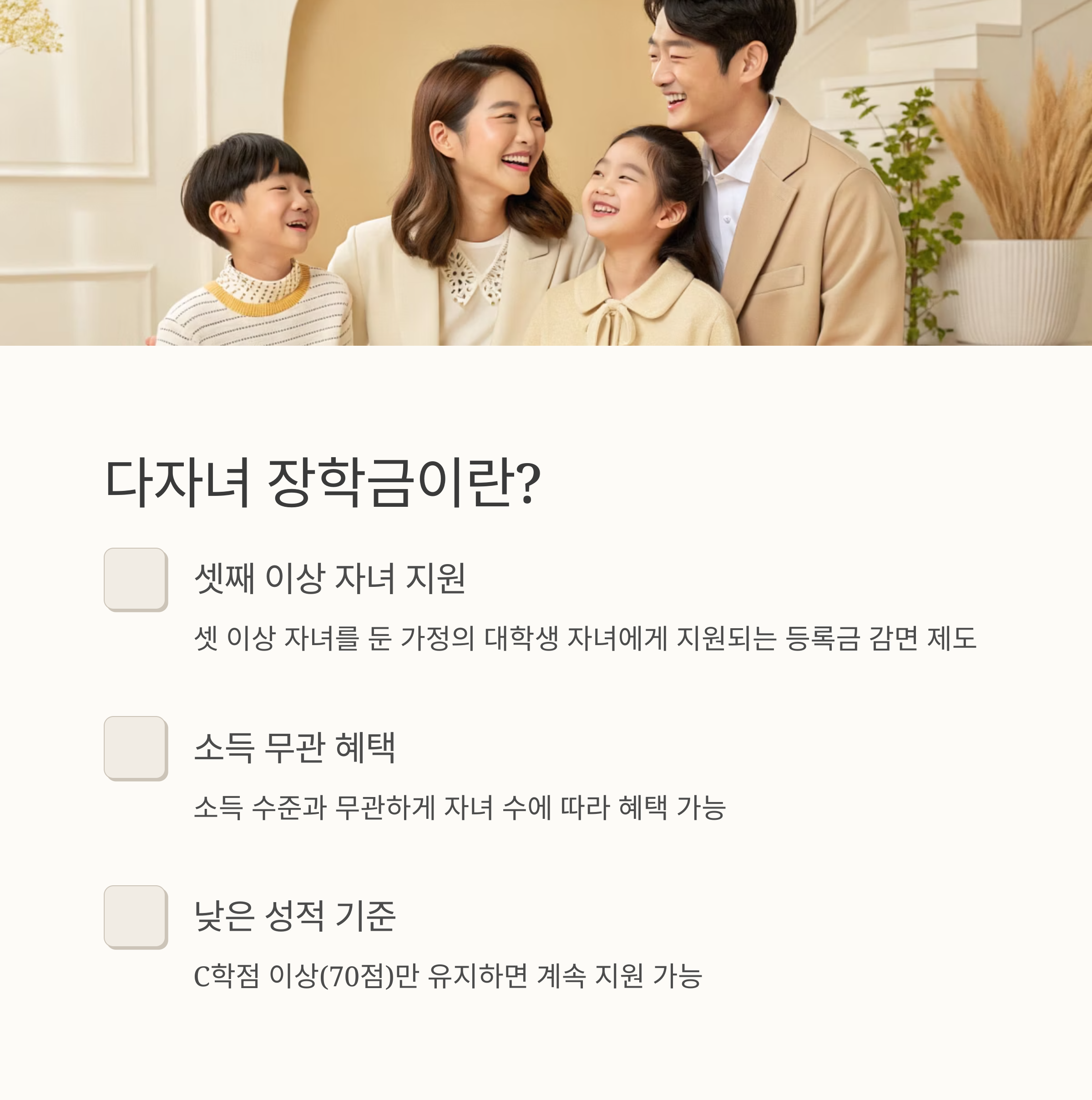 A1. 성적 조건(C학점 이상)과 자녀 순위(셋째 이상)를 만족하면 대부분 수혜 가능해요. 단, 일부 경우에는 심사에서 제외될 수 있어요.