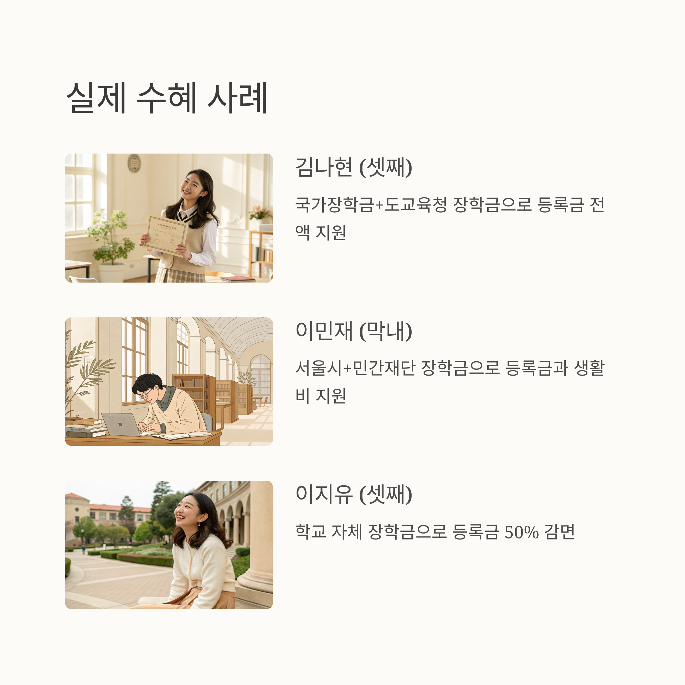 또, 대학교 1학년 신입생인 이지유 양은 학교 자체 장학금으로 등록금 절반을 감면받았어요. 부모님이 공공기관 근무 중이고, 다자녀 기준을 충족해서 별도 신청 없이 장학금이 자동 지급되었다고 해요. 이런 경우는 대학 홈페이지에서 확인하면 쉽게 파악 가능해요.