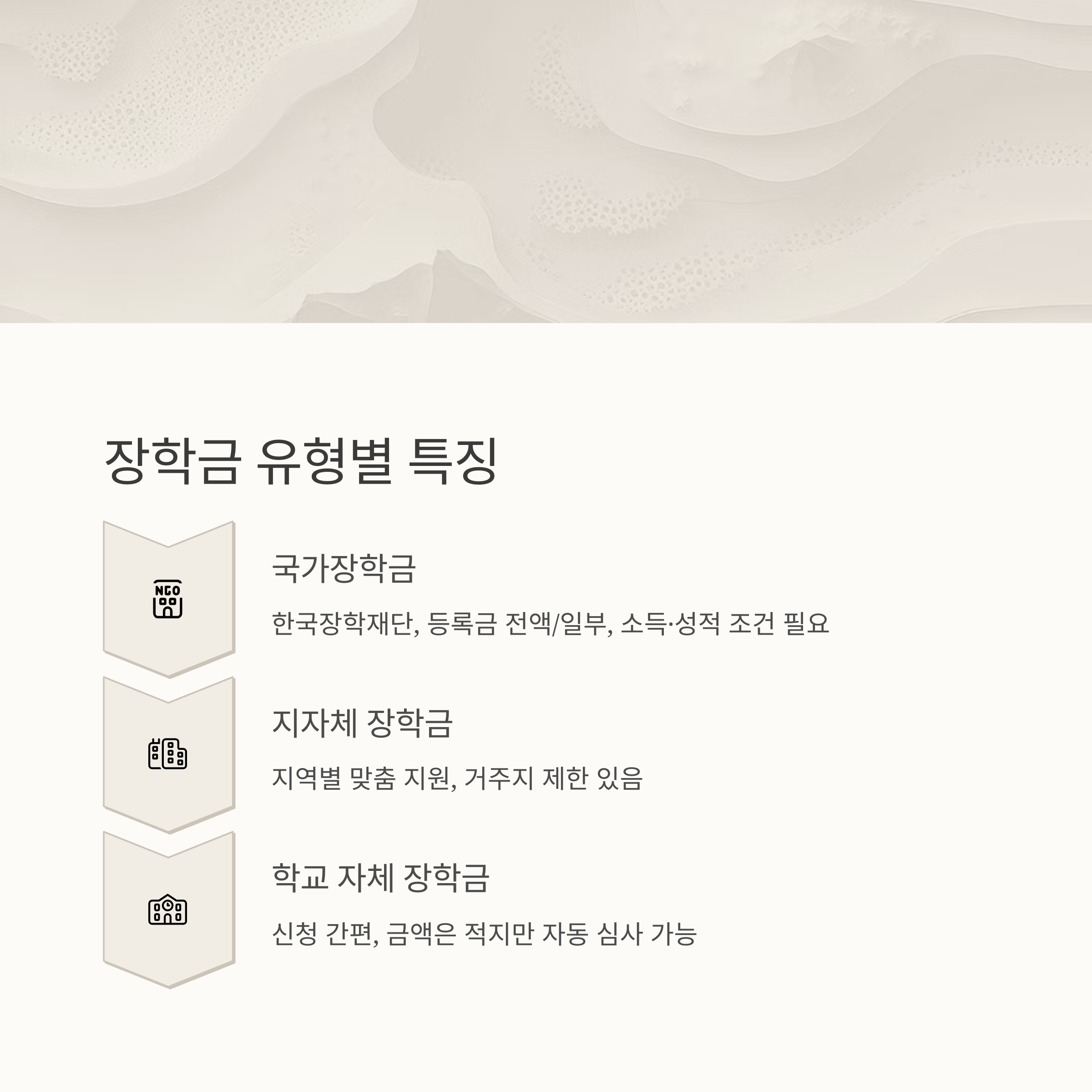 장학금 유형에 따라 신청 전략도 달라져야 해요. 여러 개 동시 신청도 가능한 경우가 많으니, 놓치지 말고 다양하게 준비해보는 게 좋아요! 😄