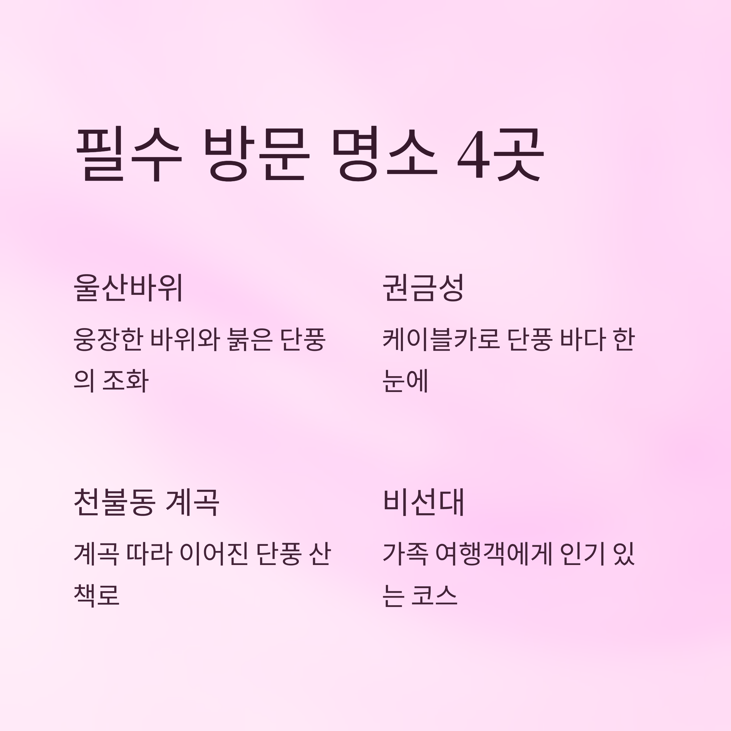 설악산엔 유명한 단풍 명소들이 다양해요. 특히 추천하는 곳은 ‘울산바위’, ‘권금성’, ‘비선대’, 그리고 ‘천불동 계곡’이에요. 각 장소마다 단풍 색과 풍경이 다르기 때문에 코스별로 둘러보면 더 만족스러운 여행이 될 거예요 🍁