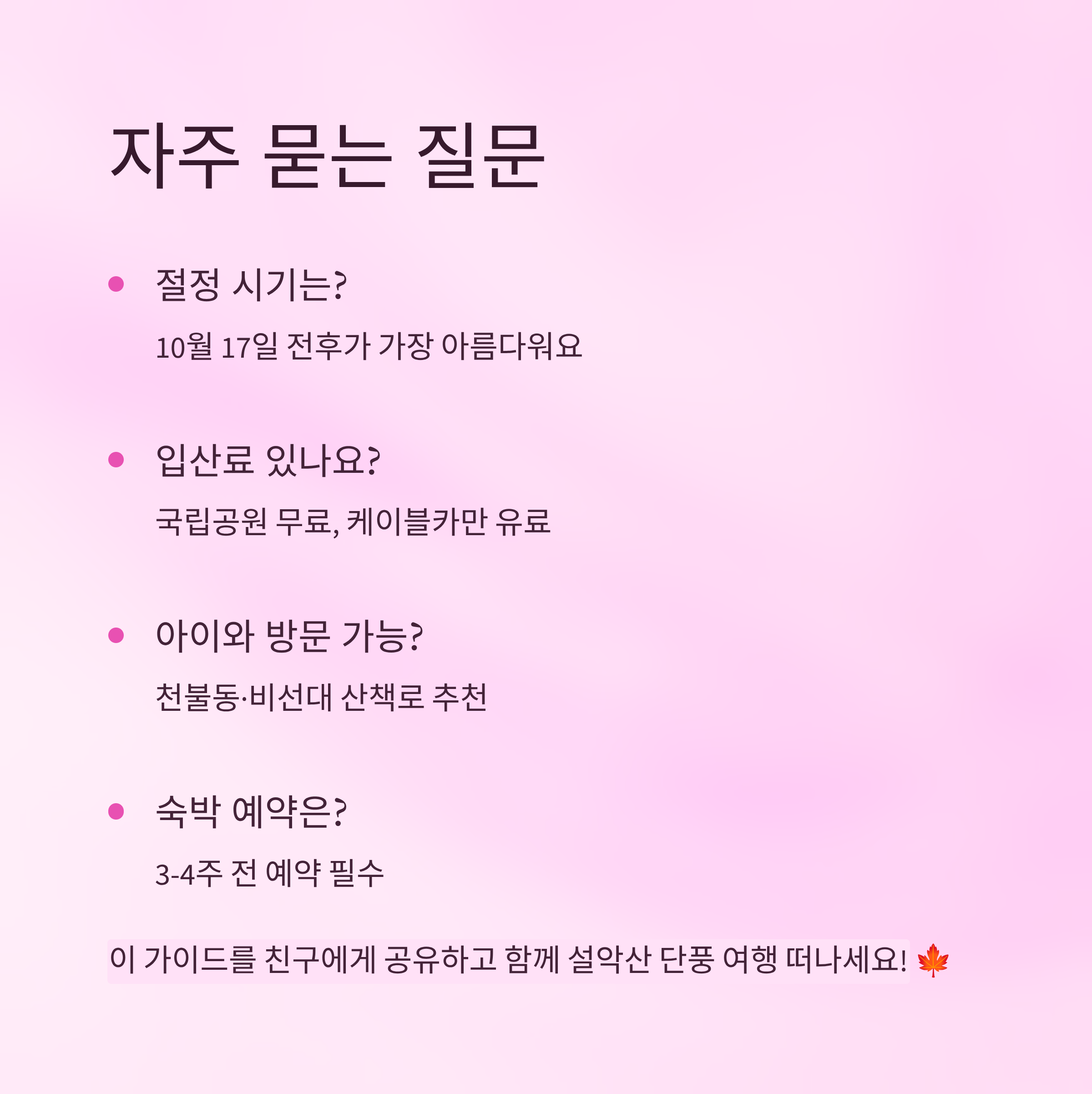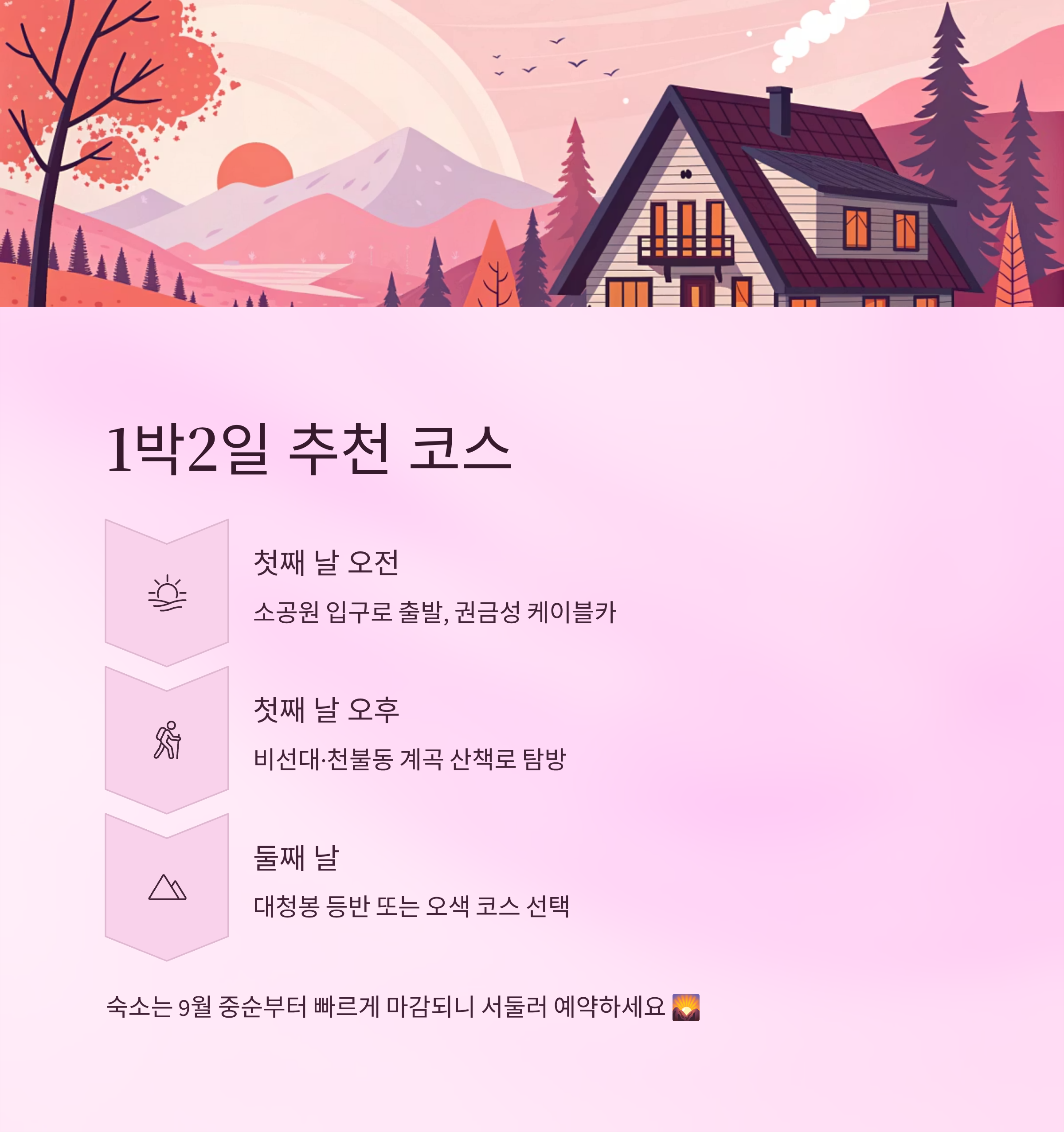 설악산은 워낙 넓고 깊은 산이라 하루에 모든 단풍 명소를 다 둘러보기는 어렵답니다. 그래서 1박 2일 코스를 계획하면 시간도 여유롭고 덜 지치게 즐길 수 있어요. 아래 코스를 참고해서 여행을 알차게 준비해보세요!